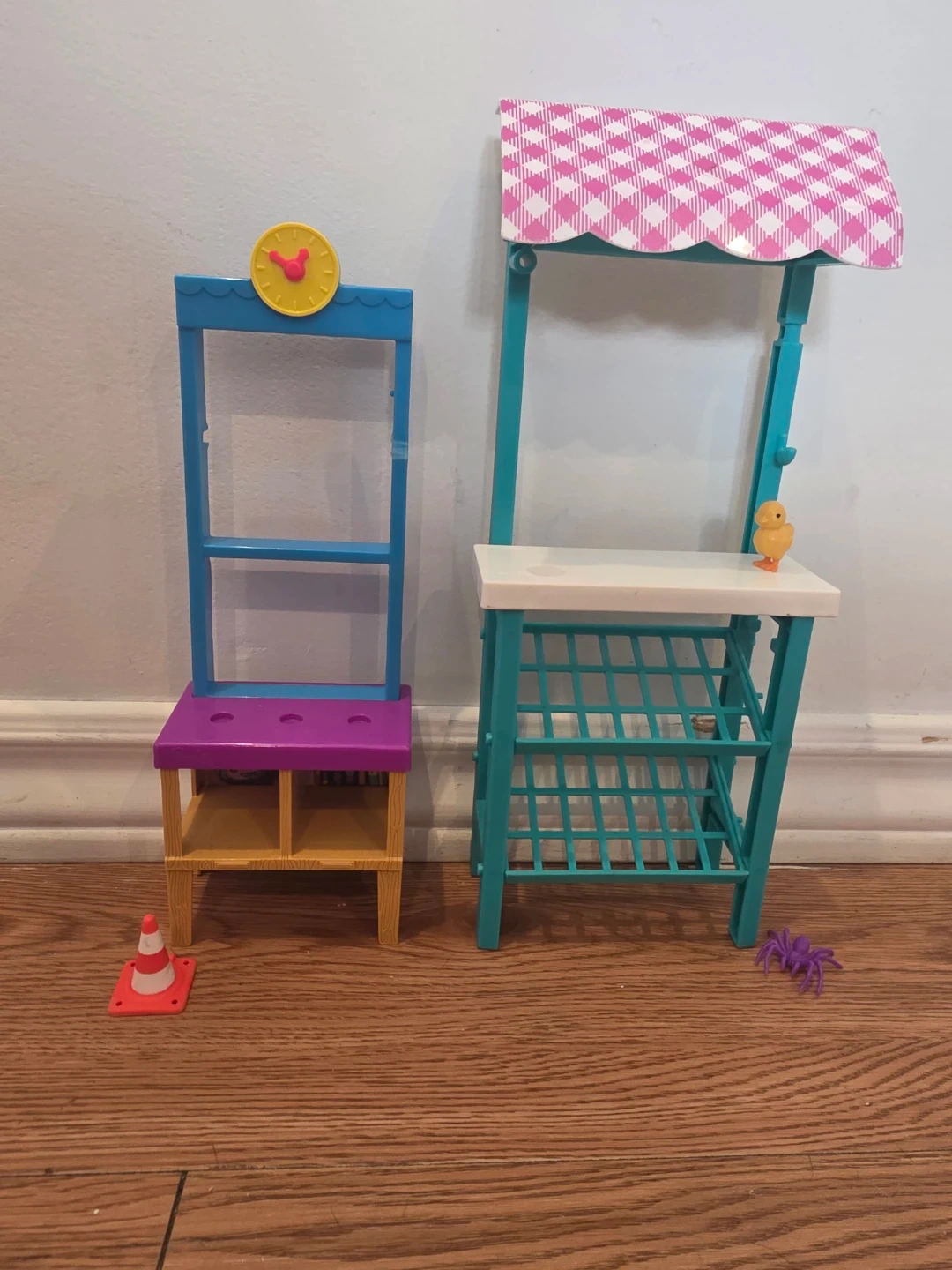 This set includes a pink and white checkered market stall with a teal frame. It also comes with a blue counter unit featuring a yellow clock. A tiny orange chick and a purple spider figure are included for play. These are fun accessories for imaginative play!