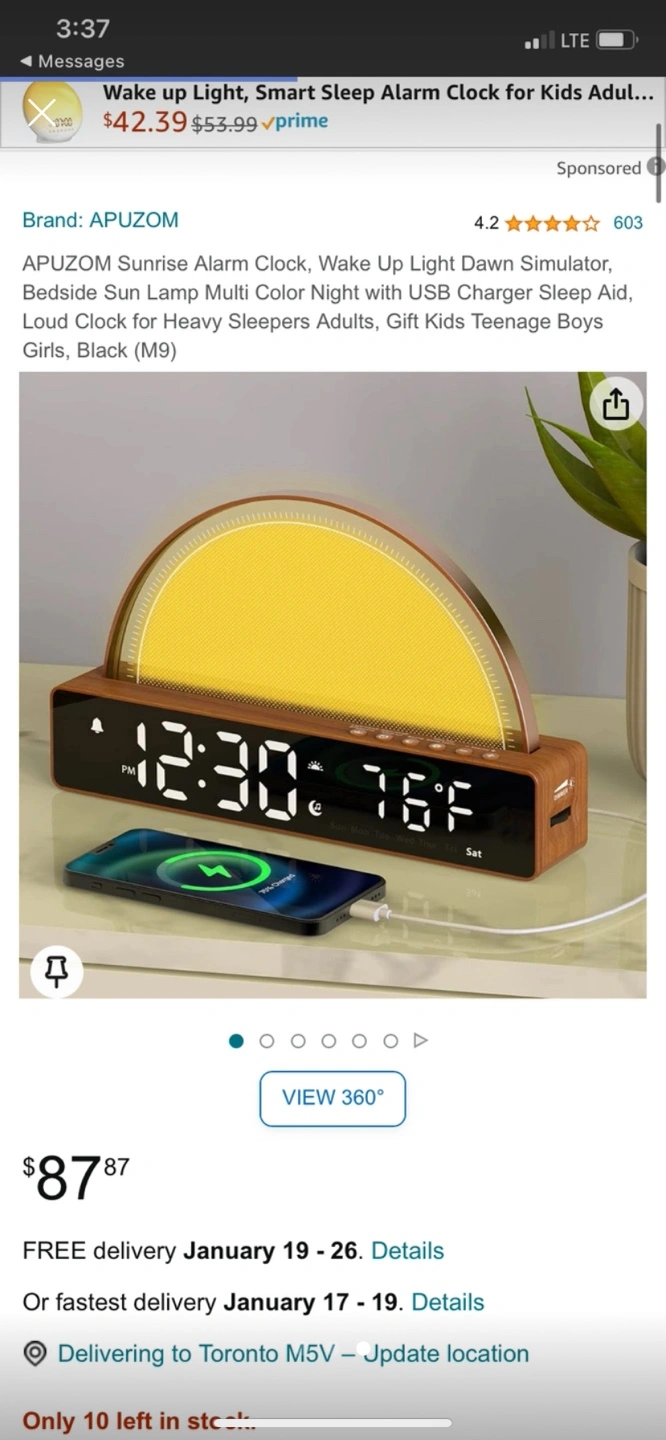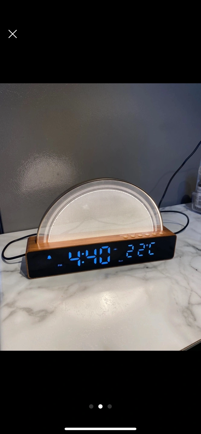 Alarm clock with a 'sunrise' light to wake you up gently. Has lots of other settings including USB port and multiple alarm sounds. Used for a bit and works perfectly. $87 full price plus tax.