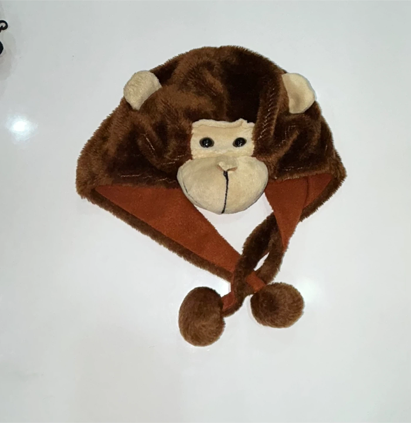 This plush hat is designed to look like a monkey's face with fuzzy brown fur.