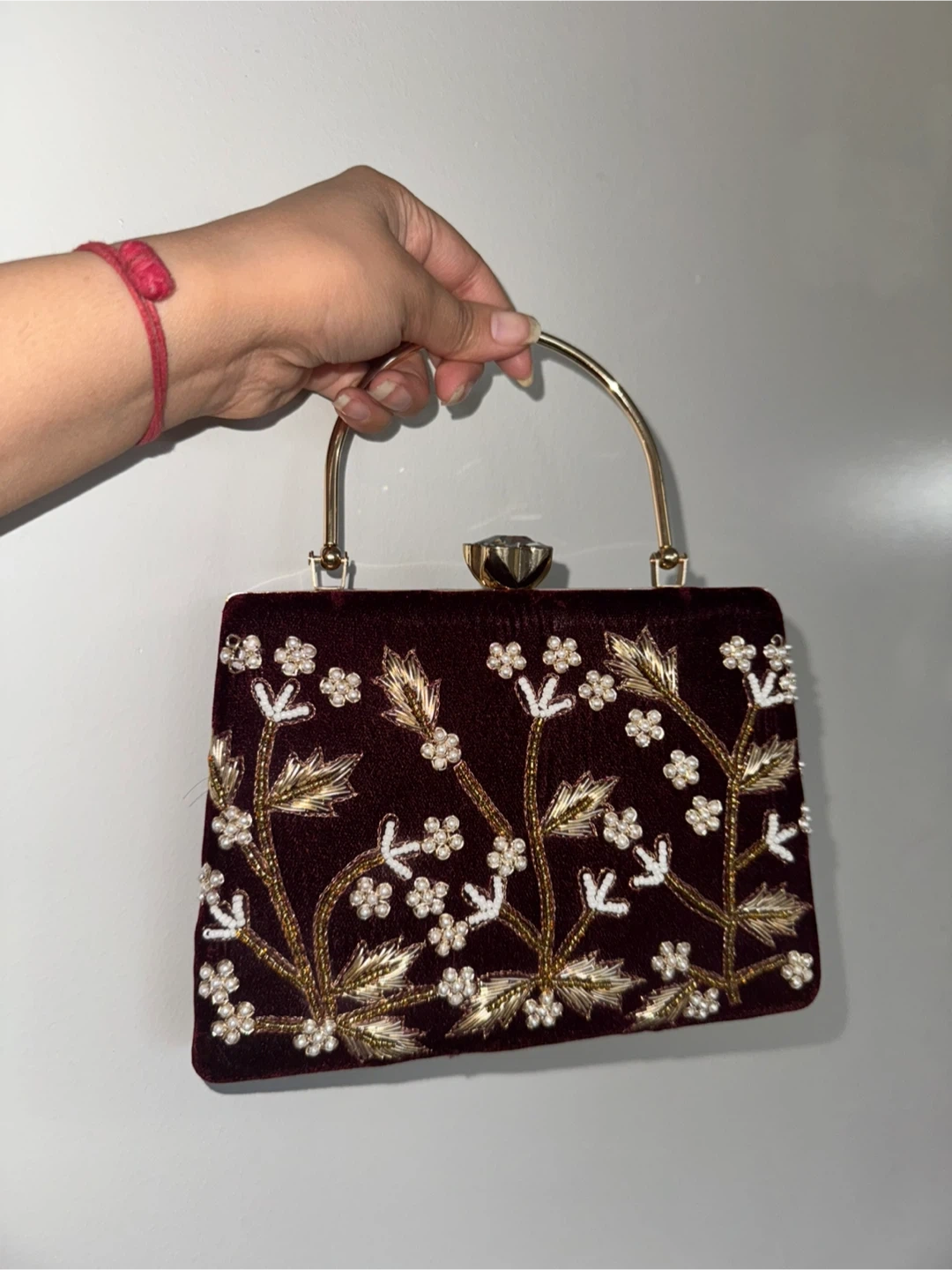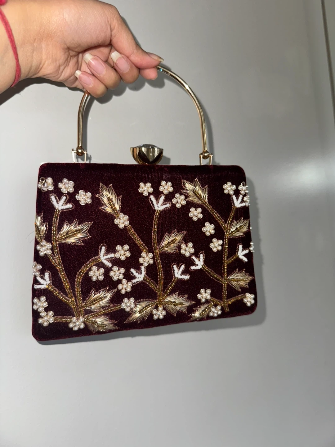 Brand new maroon velvet clutch purse, never used. Beautiful statement piece with pearl and gold floral embroidery and a gold metal handle. Perfect for weddings, parties, festive events, and traditional outfits.