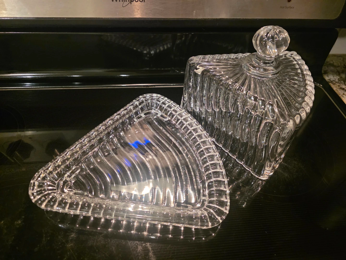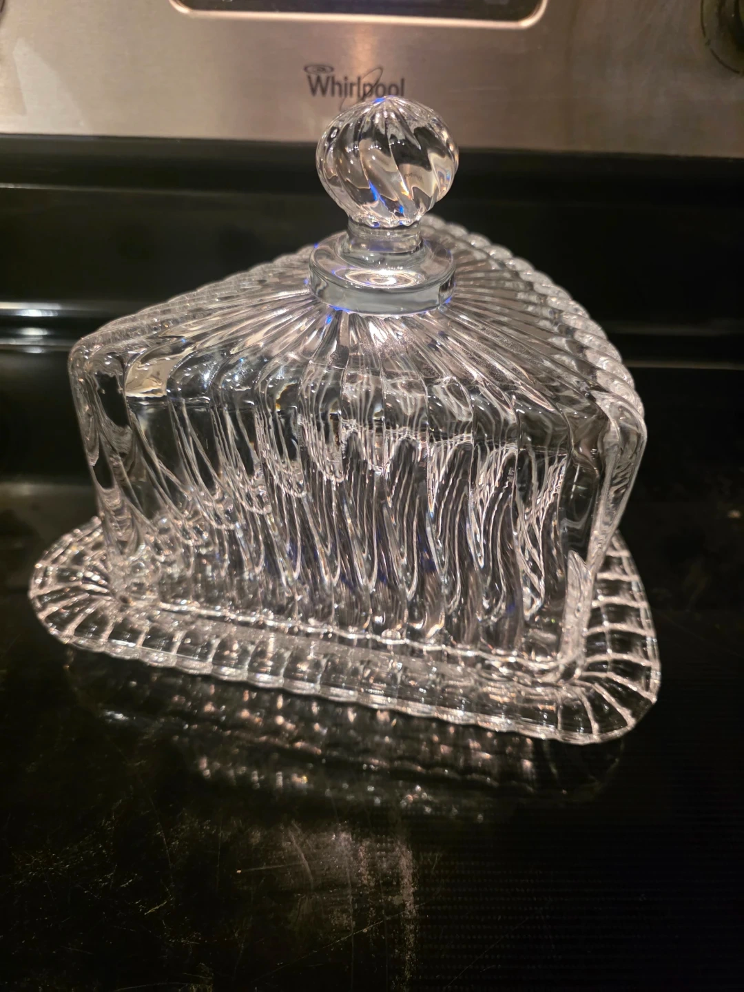 Clear glass dish with a decorative ridged pattern and a knobbed lid. Its classic design makes it a lovely addition to any kitchen or dining table.