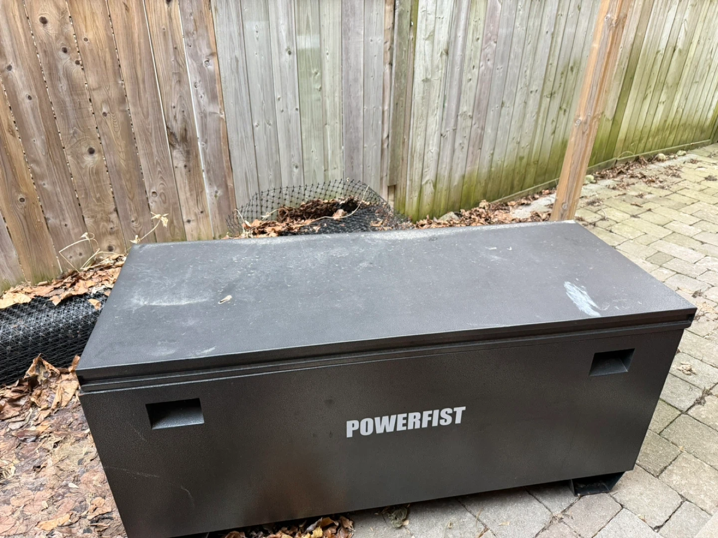 This is a POWERFIST outdoor storage box. It's made of durable material and has a hinged lid. Plenty of space for storing cushions or garden tools.