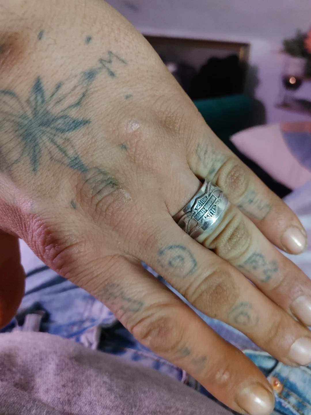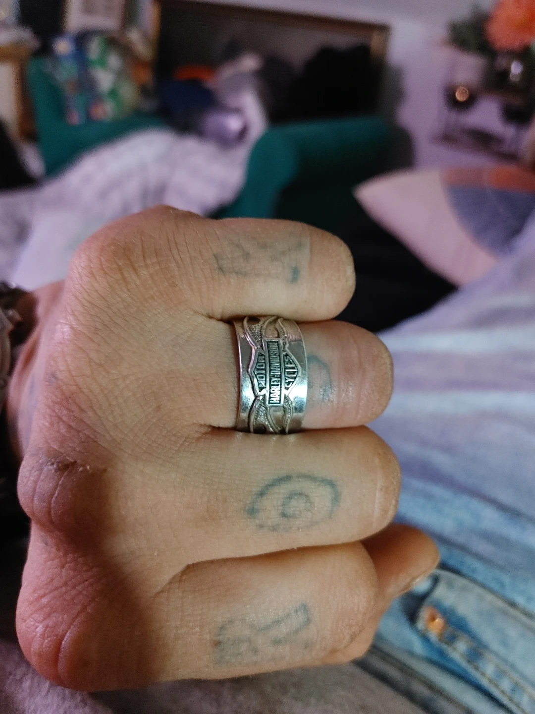 This is a Harley-Davidson band ring with the signature logo. It's made of silver-toned metal and features an intricate embossed design. This ring would be a cool accessory for any Harley enthusiast!