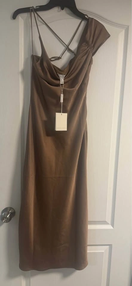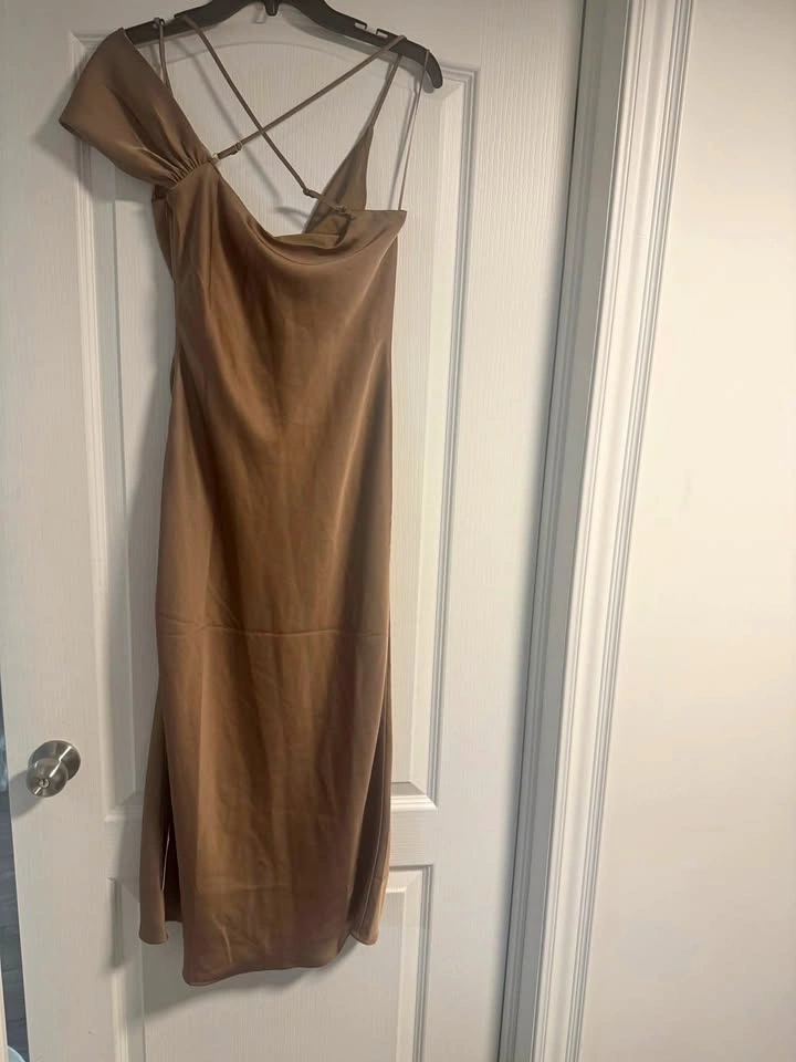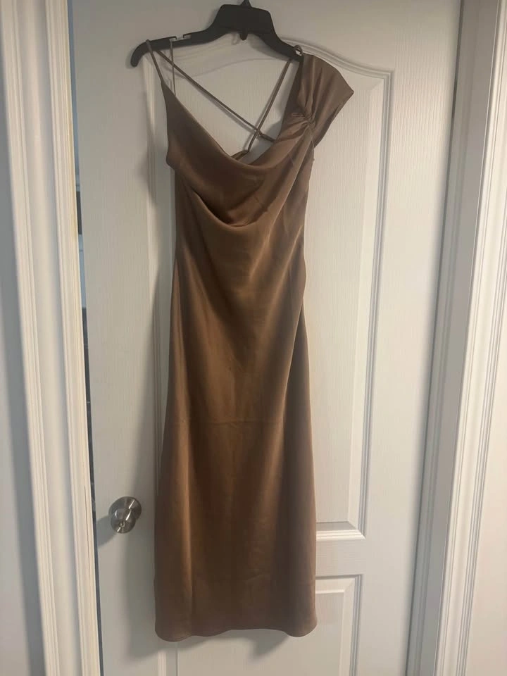 Silky Pretty Lavish brown/taupe satin midi dress. Features a chic cowl neck and one-shoulder design. Adjustable spaghetti straps with a criss-cross detail in the back. New with tags. Size US 4.