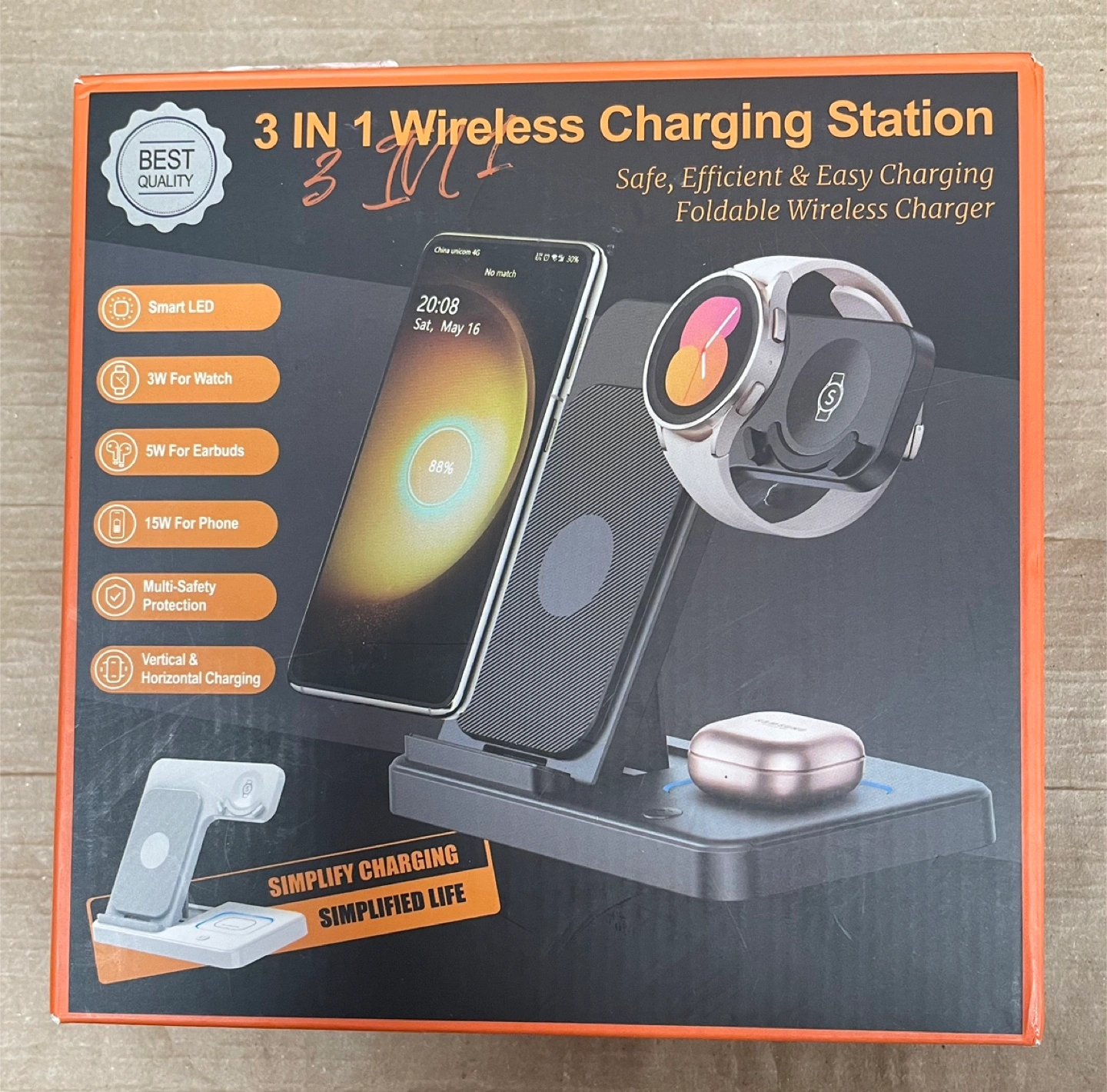 This 3-in-1 wireless charging station charges your phone (15W max), watch (3W max), and earbuds (5W max) all at once. It features a foldable design for easy storage and portability. Multiple safety protections are included for peace of mind.