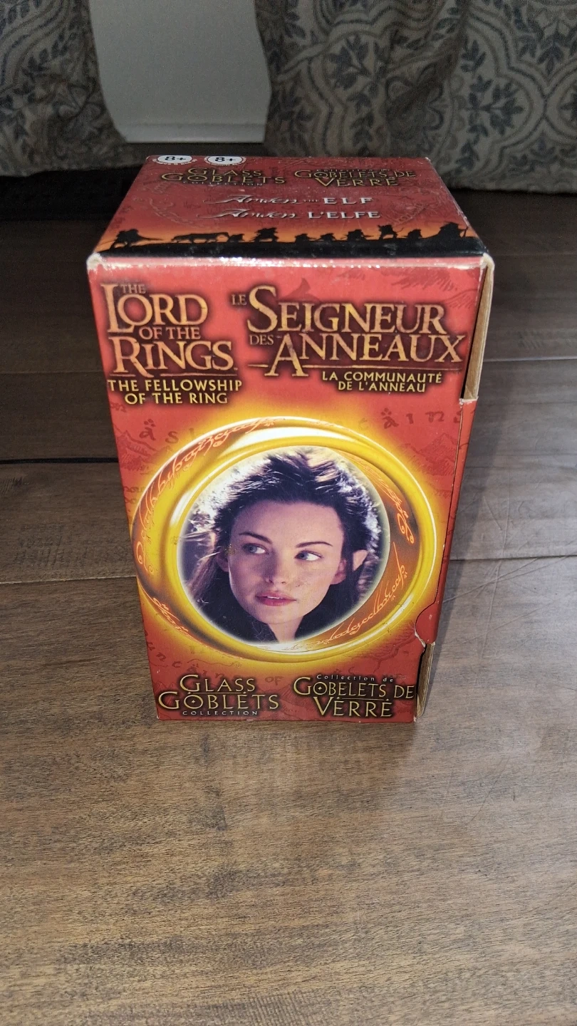 Glass goblet from The Lord of the Rings: The Fellowship of the Ring collection. Embossed with "Lord of the Rings The Fellowship of the Ring". Includes original box. Perfect for fans of the series!