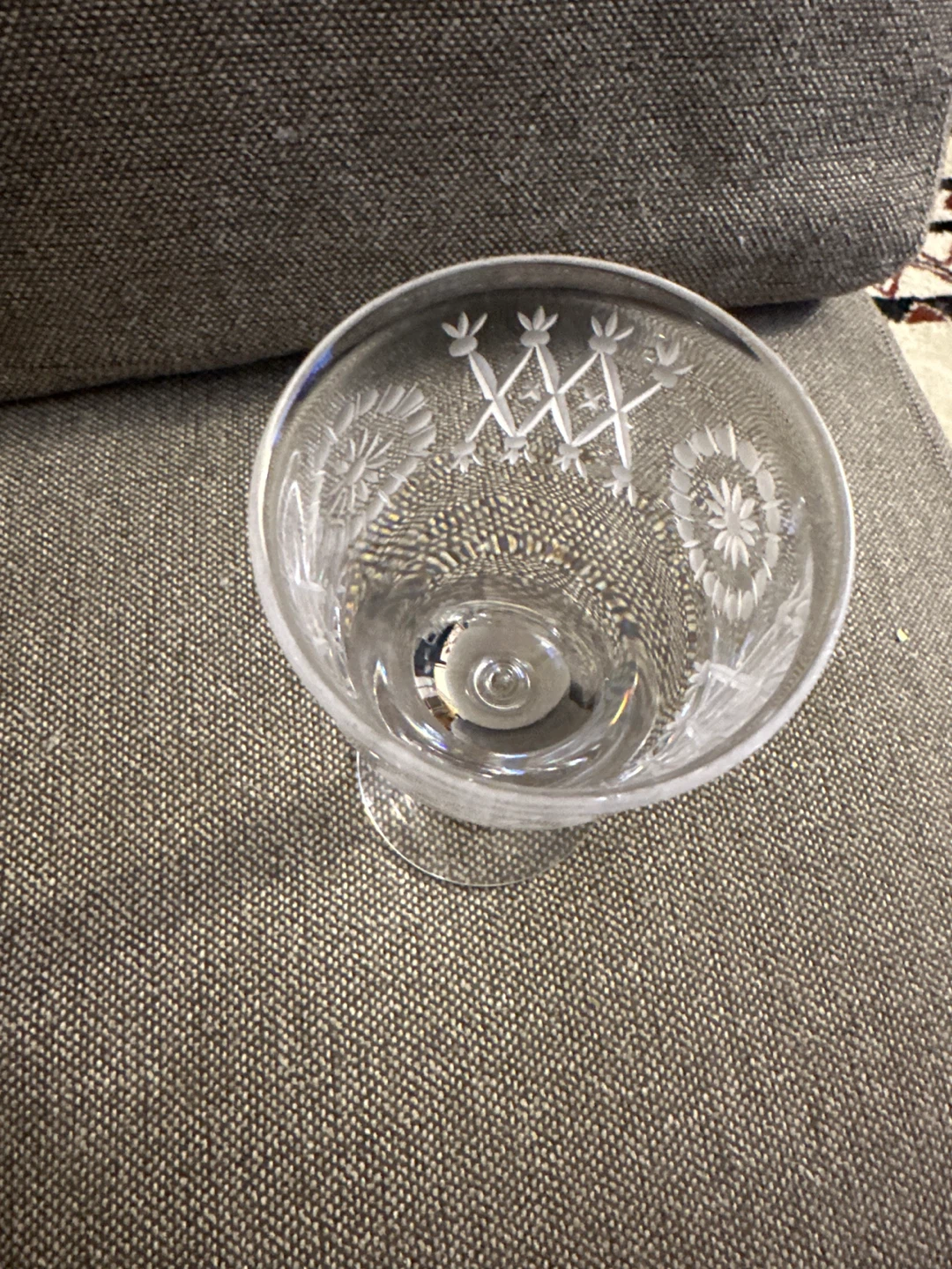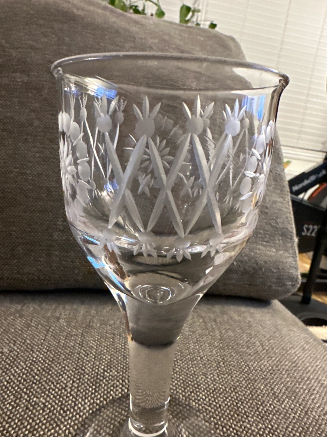 Selling a beautiful etched glass wine goblet. It has a lovely floral and geometric pattern etched into the glass. Perfect for adding a touch of elegance to your table setting!