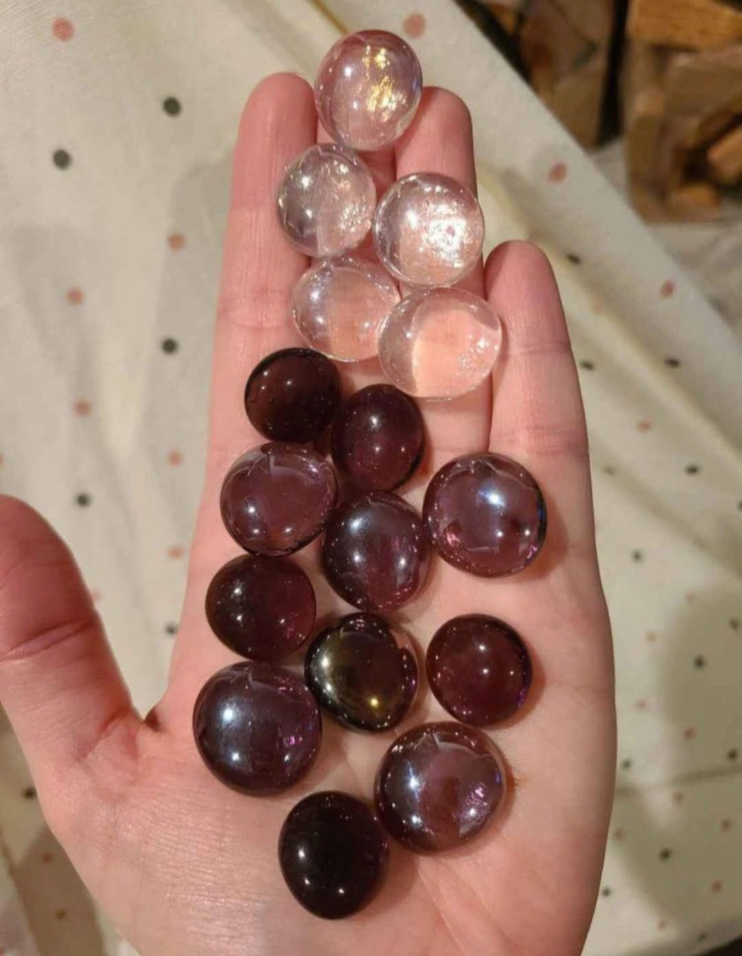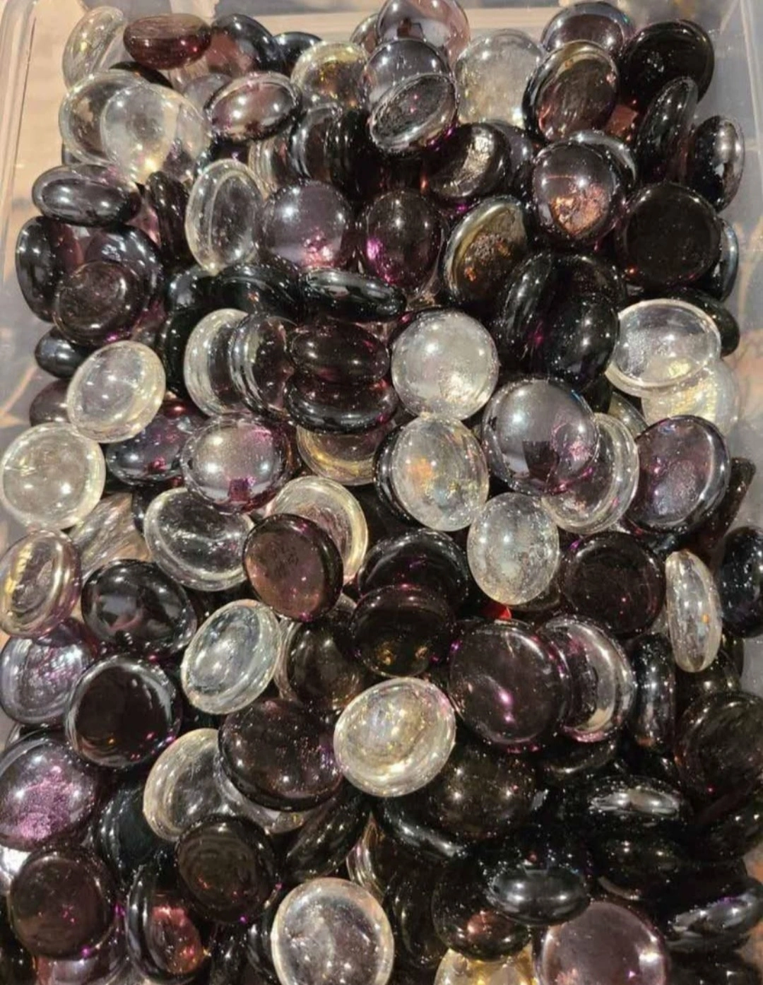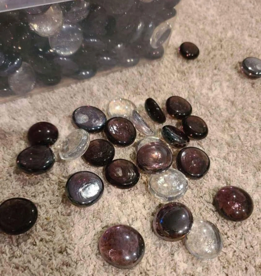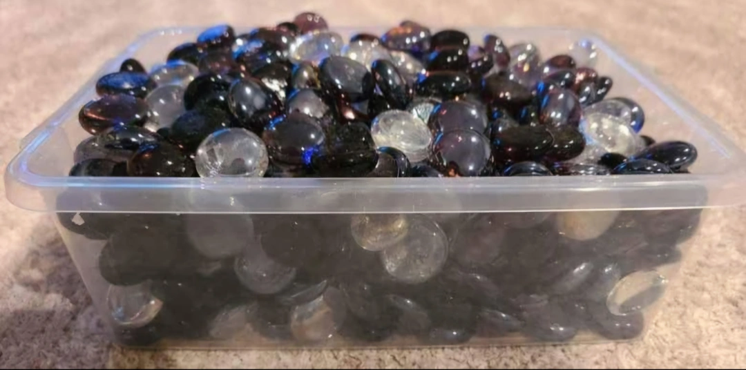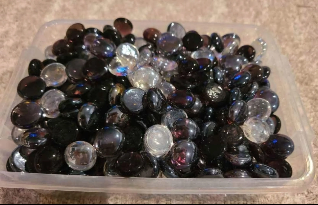 Lots of decorative glass stones. Great for vases, bowls, or other craft projects. Mix of black and clear. Sold in bulk.