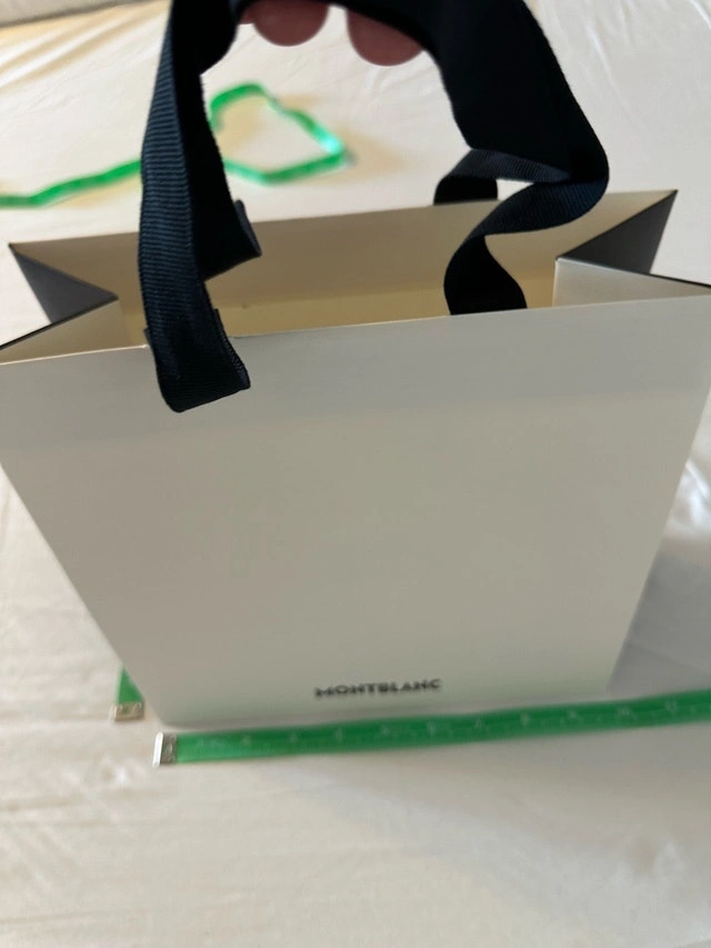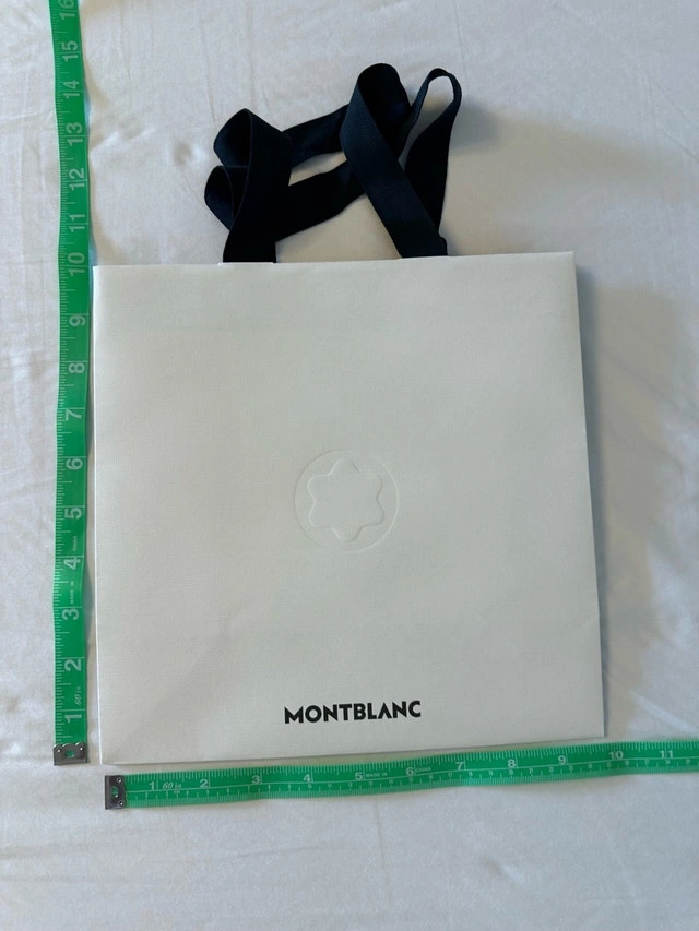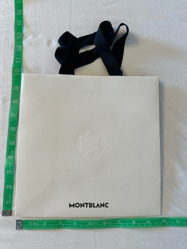 Gently used Montblanc designer boutique paper gift bag, perfect for adding a touch of luxury to your gifts or collections. Measuring approximately 26cm x 26cm x 10cm, it features sturdy black fabric handles and the iconic Montblanc logo. A chic and reusable option for any occasion! Brand: Montblanc. Material: High-quality paper stock. Handles: Black fabric. Dimensions: Approximately 26cm x 26cm x 10cm. Asking $45. Ideal as a movie prop, great item for home staging, or a wonderful addition to your shopping bag collection. We live near Highway 404 and Highway 407, close to Vaughan, Thornhill, Richmond Hill, Aurora, Woodbridge, Brampton, Mississauga, Scarborough, Etobicoke, Newmarket, Toronto, and other surrounding areas. If the ad is up, it's available.