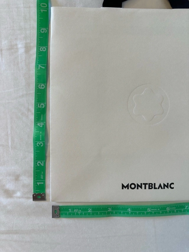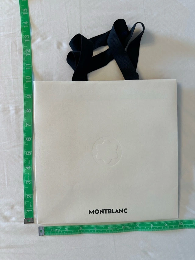 Gently used Montblanc designer boutique paper gift bag, perfect for adding a touch of luxury to your gifts or collections. Measuring approximately 26cm x 26cm x 10cm, it features sturdy black fabric handles and the iconic Montblanc logo. A chic and reusable option for any occasion! Brand: Montblanc. Material: High-quality paper stock. Handles: Black fabric. Dimensions: Approximately 26cm x 26cm x 10cm. Asking $45. Ideal as a movie prop, great item for home staging, or a wonderful addition to your shopping bag collection. We live near Highway 404 and Highway 407, close to Vaughan, Thornhill, Richmond Hill, Aurora, Woodbridge, Brampton, Mississauga, Scarborough, Etobicoke, Newmarket, Toronto, and other surrounding areas. If the ad is up, it's available.