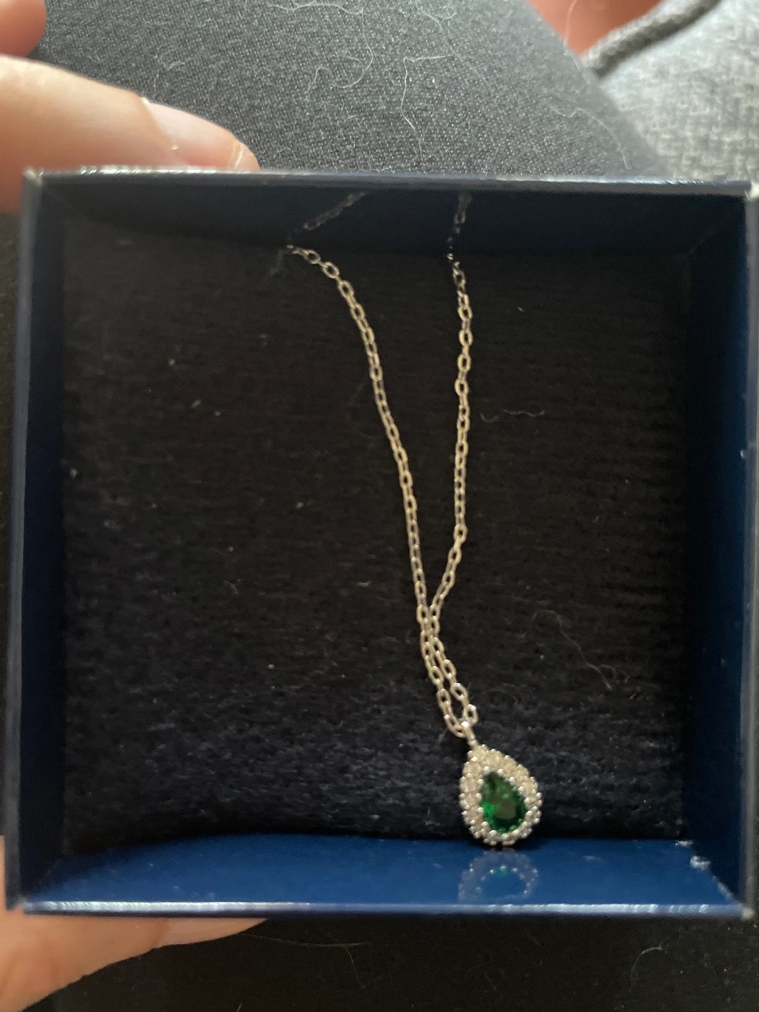Selling a lovely necklace featuring a teardrop-shaped green stone pendant surrounded by clear stones! It comes in a box, making it perfect for gifting or keeping it safe when you're not wearing it: NOT sterling silver, reflective in price