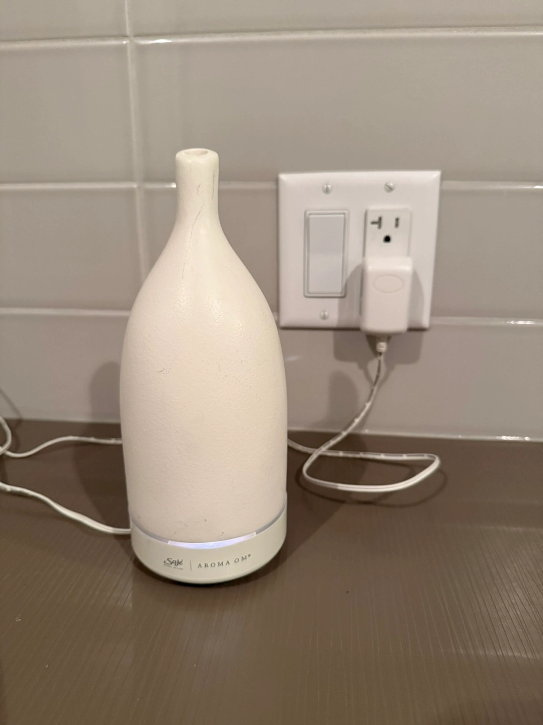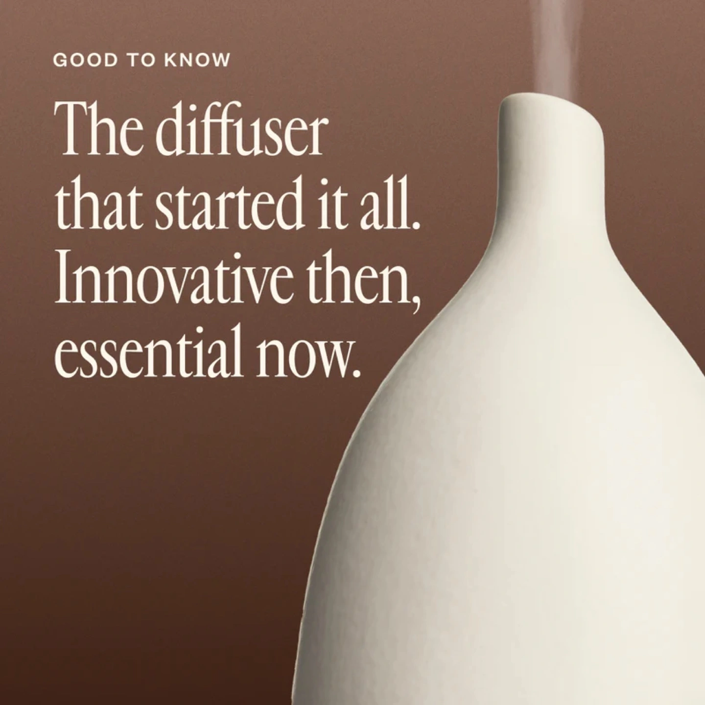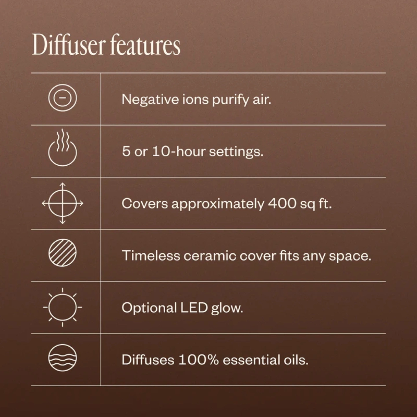 Heat-free ultrasonic diffuser. Cool mist. Ceramic cover. 120ml tank. Great for aromatherapy. Gently diffuses essential oils.