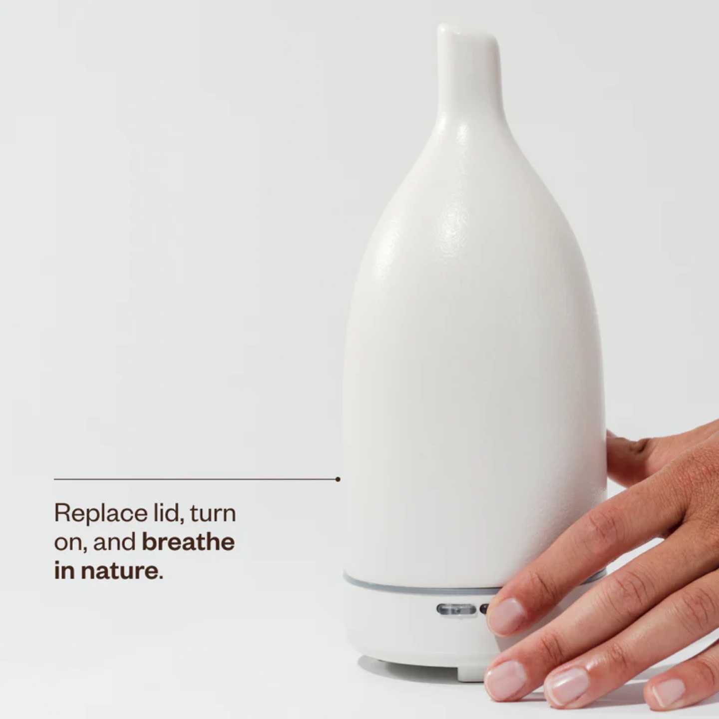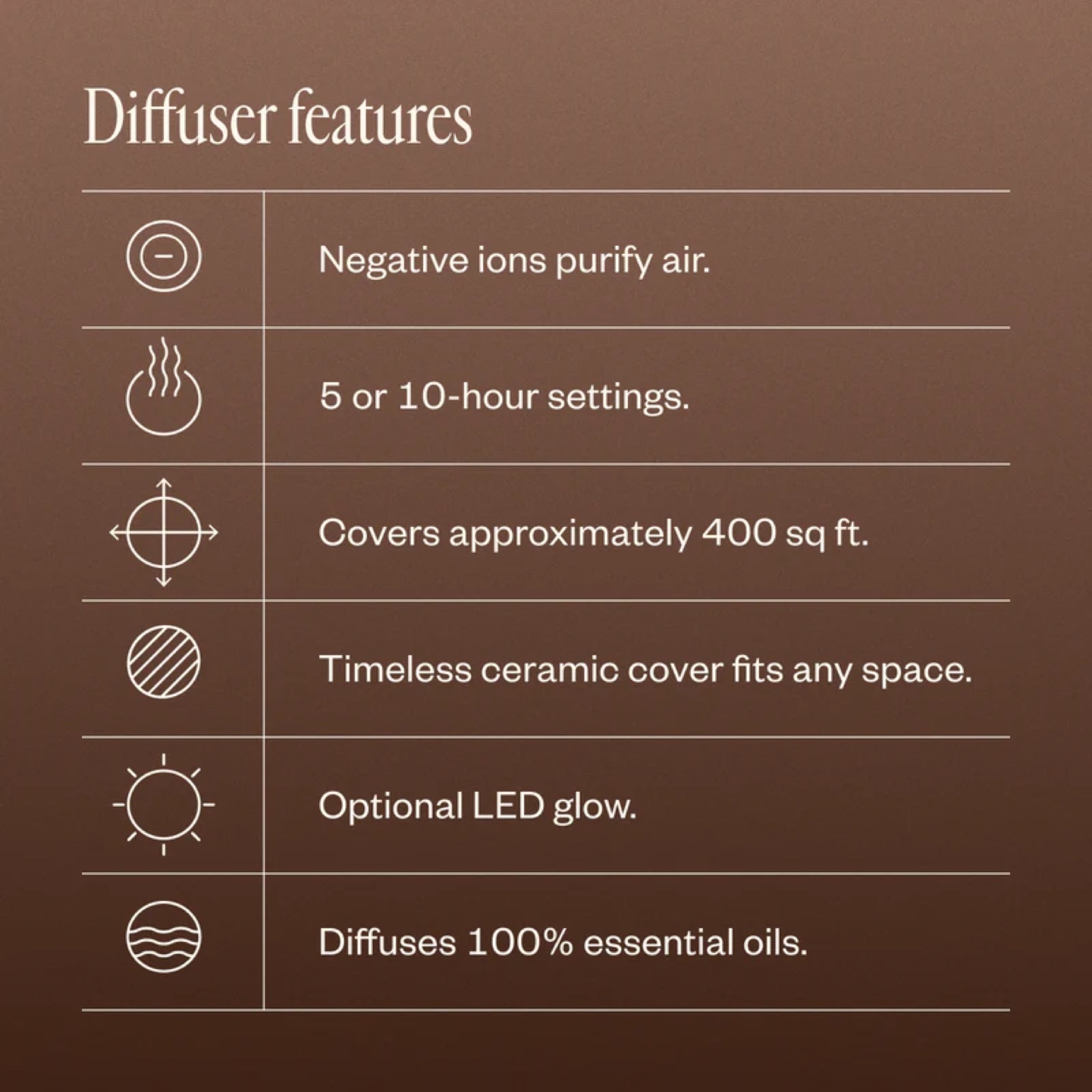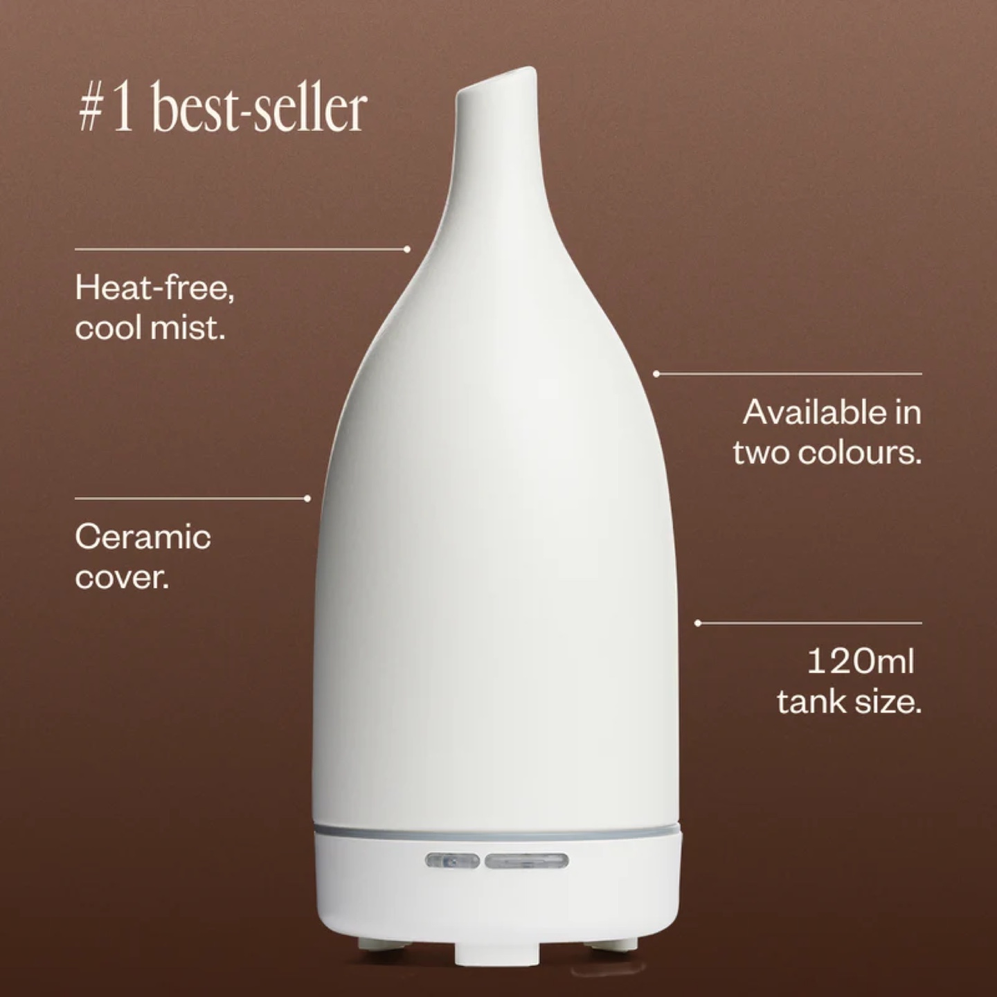 Heat-free ultrasonic diffuser. Cool mist. Ceramic cover. 120ml tank. Great for aromatherapy. Gently diffuses essential oils.