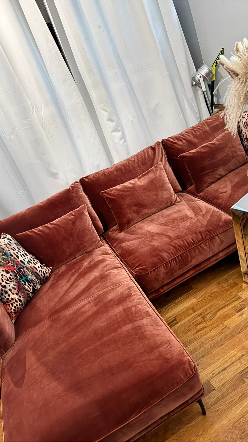 Selling a comfortable L-shape sectional sofa from Jason Furniture! The sofa features a soft, velvety texture and is in a warm, inviting color. It's perfect for lounging and adding a touch of elegance to your living space.