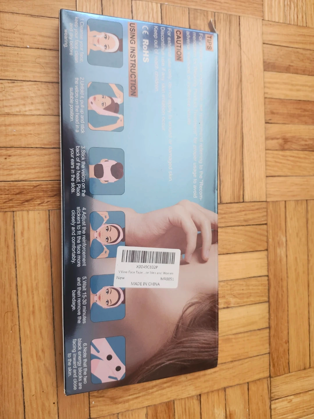 I'm selling a V-Line Face Slimming Strap that helps to eliminate sagging, reduce double chin, lift jawline, and slim face shape. It's designed for both men and women. The box includes instructions on how to use the strap for best results. It's made in China