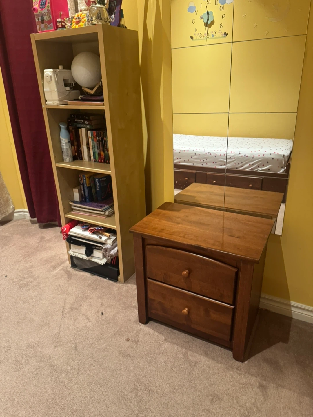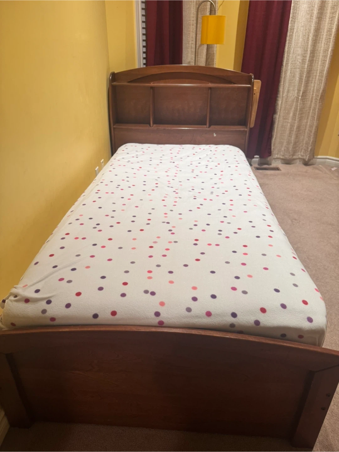 A warm wood twin bed frame featuring a bookcase headboard with cubbies for storage. It includes two convenient drawers built into the foot of the bed for extra space and matching nightstand. This bed's classic design makes it a great addition to any child's or guest bedroom.