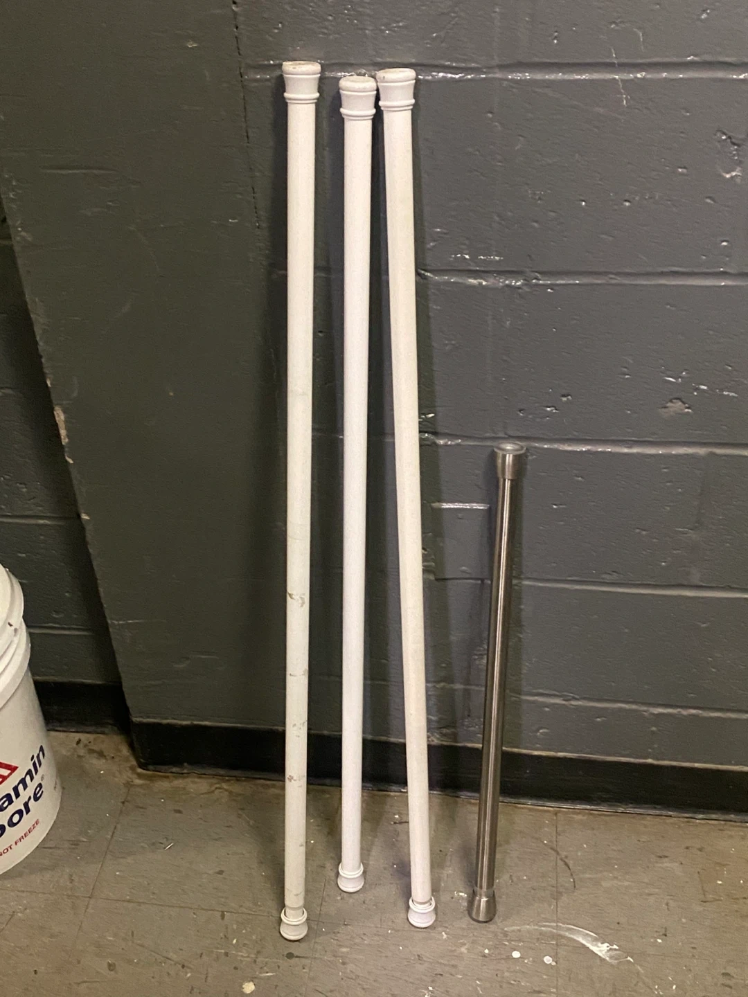 Set of three white telescopic poles. Each pole has a capped end. Comes with one metal rod. Poles are adjustable in length. Likely used for Curtains.