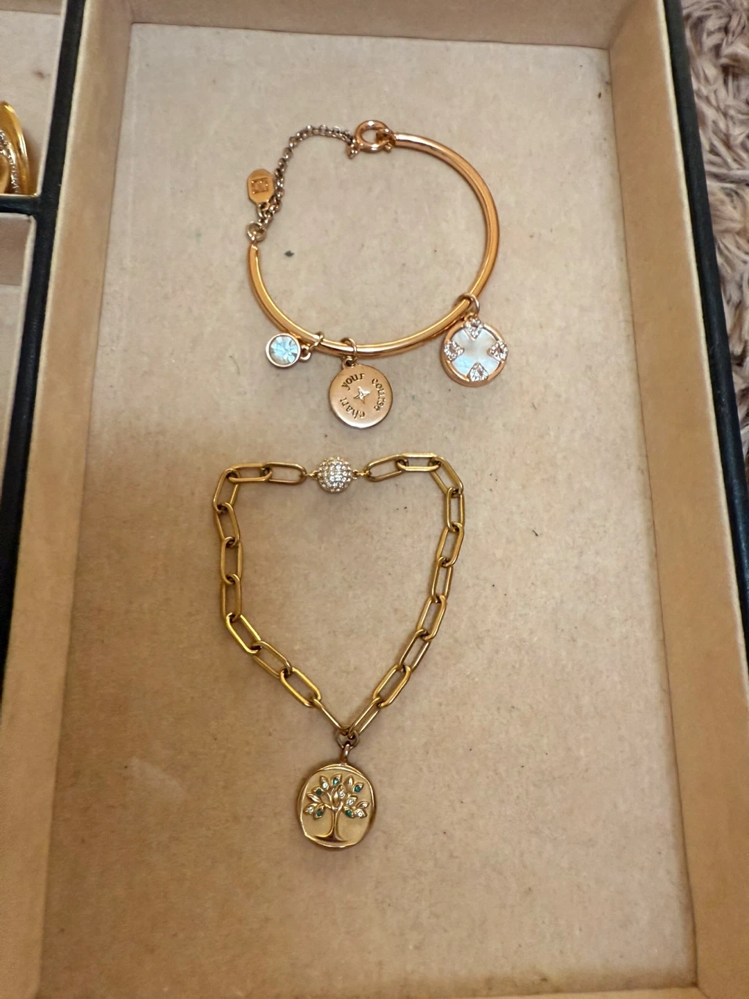 Selling these two bracelets! Both are in great condition and would make a wonderful addition to your jewelry collection. One is a charm bracelet with a little pendants, and the other is a chic chain bracelet with a tree of life charm