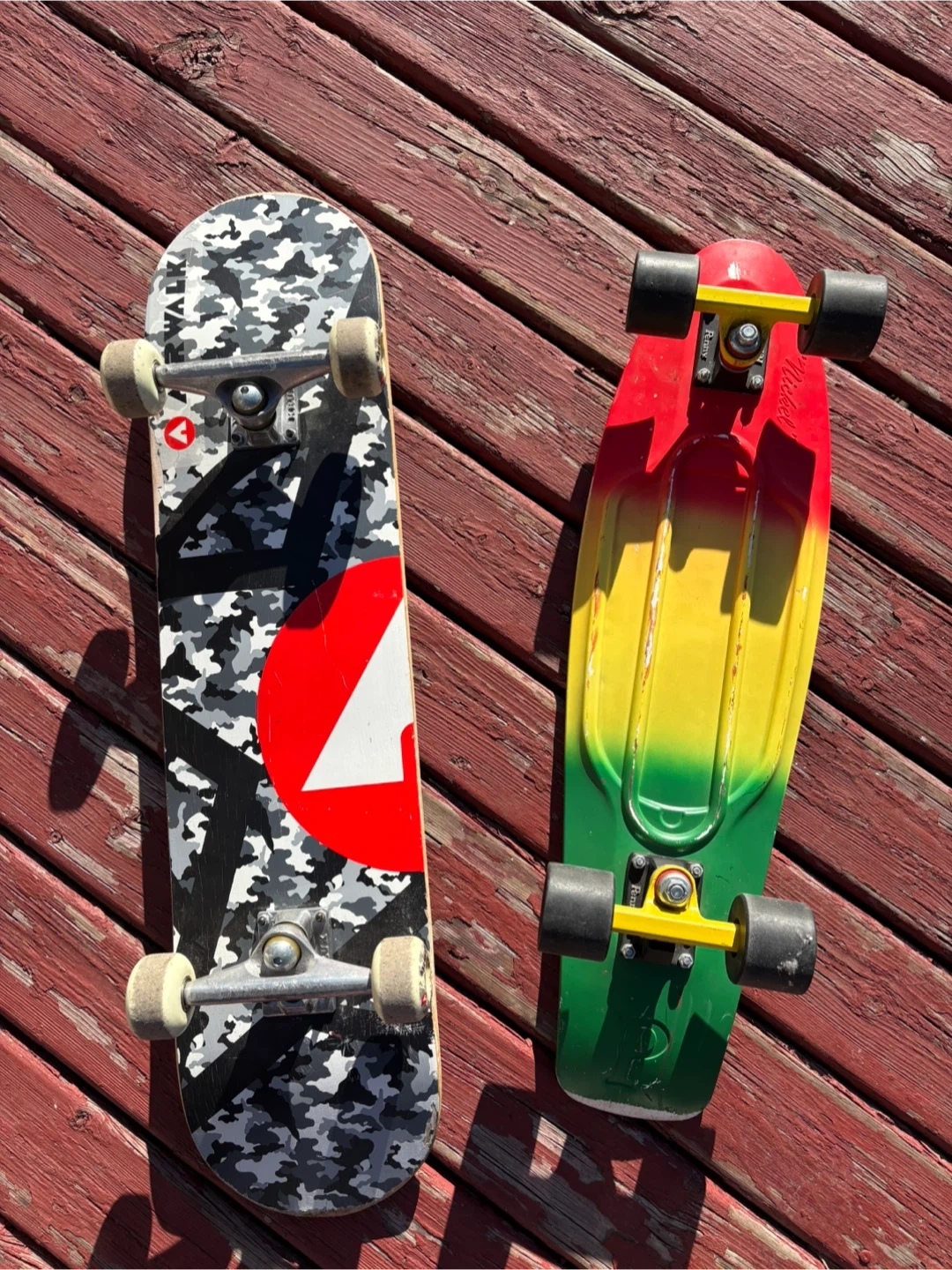 This listing includes a colourful Penny board with a rasta-themed design and a standard skateboard. Both are ready for cruising! Penny board has a plastic deck and standard skateboard has a wooden deck.