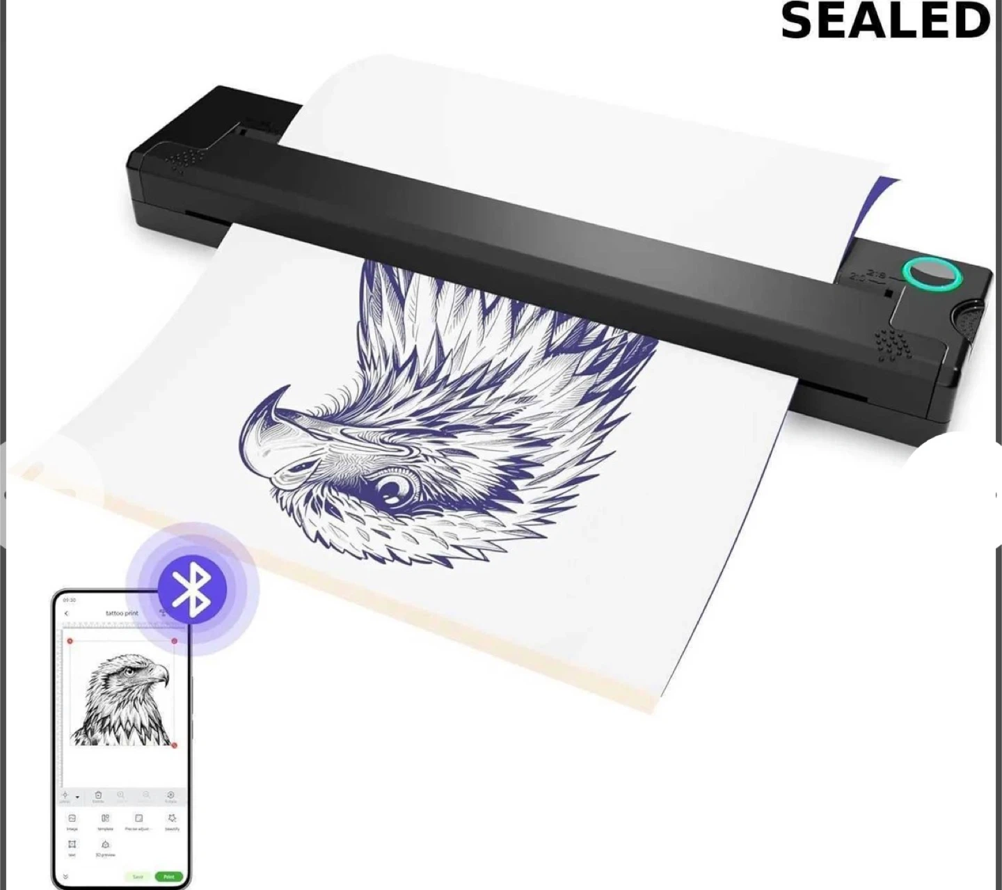 Print your tattoo designs wirelessly with this Peripage printer. It's designed for easy transfer of stencils. Connect via Bluetooth and start printing your artwork!