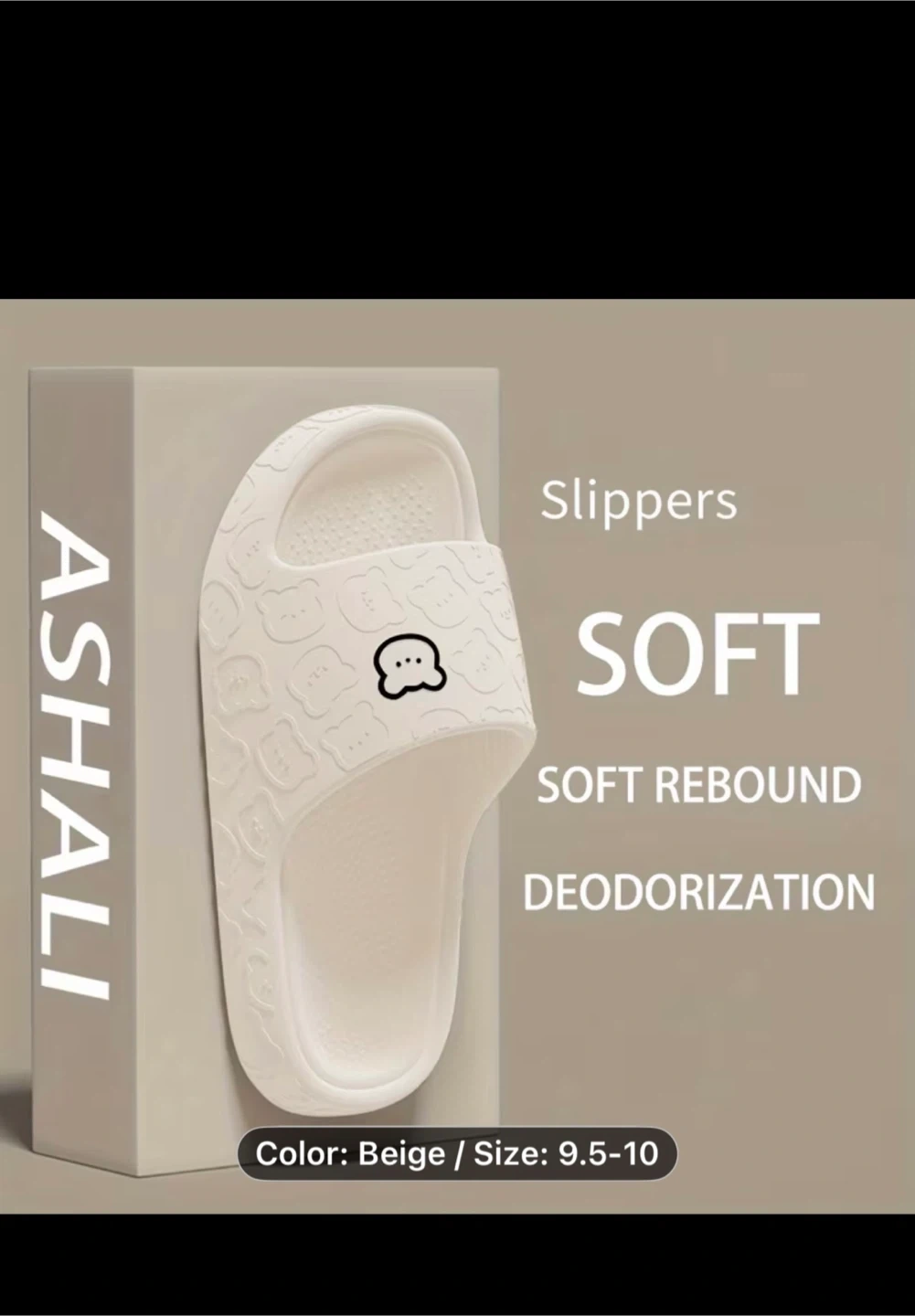 ASHALI soft slides with a comfortable rebound and deodorizing properties. The colour is beige and the size is 9.5-10. These slippers are great for everyday wear.