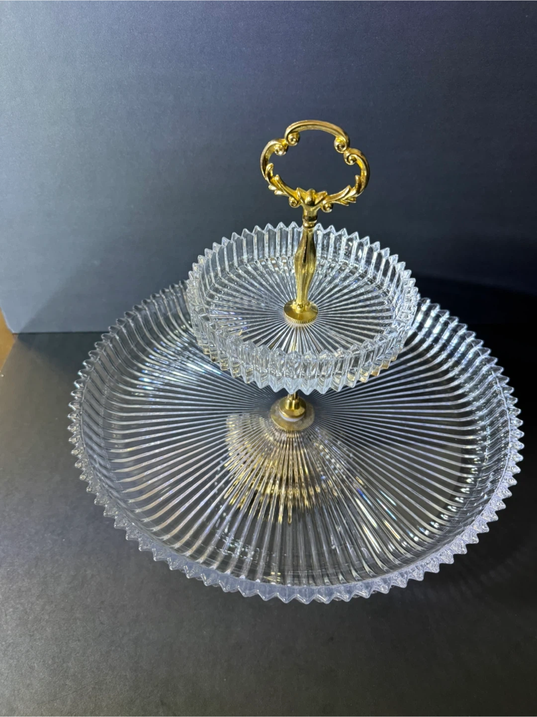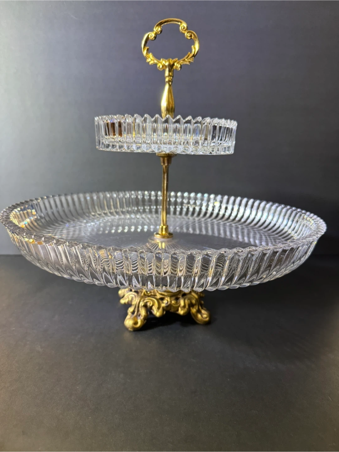 Selling a lovely two-tiered dessert stand! It's perfect for displaying treats at parties or adding a touch of elegance to your kitchen. The stand features crystal plates with a brass gold-tone handle and base. It's in great condition and ready to be the centrepiece of your next gathering. High 13 inch, Diameter 13.5-6 inch