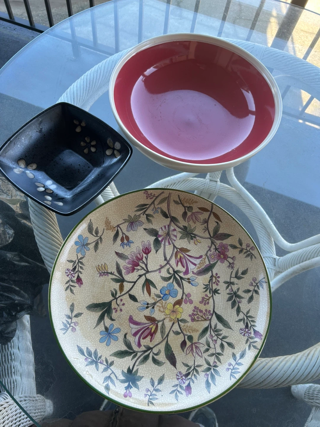 This set includes a large red bowl, a small black square bowl with floral accents, and a decorative plate with a floral pattern. The plate has a vintage look with a crackle glaze finish. They're great for serving or display! Super cute but we’re downsizing
