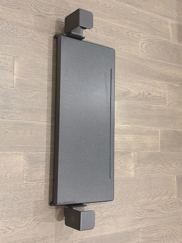This is a used ErgoActive extra wide keyboard tray with a clamp on for easy installation and desk organization. It measures 27.5" x 12" and fits a full-size keyboard and mouse. Installing it won't damage your desk at all; no screws or tools are needed. It attaches quickly with the included adjustable rubber padded C-clamps. An anti-slip back rail helps stop items from falling.