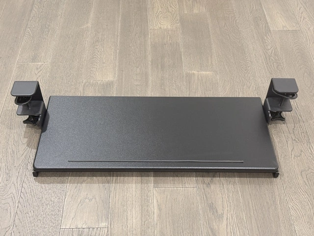 This is a used ErgoActive extra wide keyboard tray with a clamp on for easy installation and desk organization. It measures 27.5" x 12" and fits a full-size keyboard and mouse. Installing it won't damage your desk at all; no screws or tools are needed. It attaches quickly with the included adjustable rubber padded C-clamps. An anti-slip back rail helps stop items from falling.
