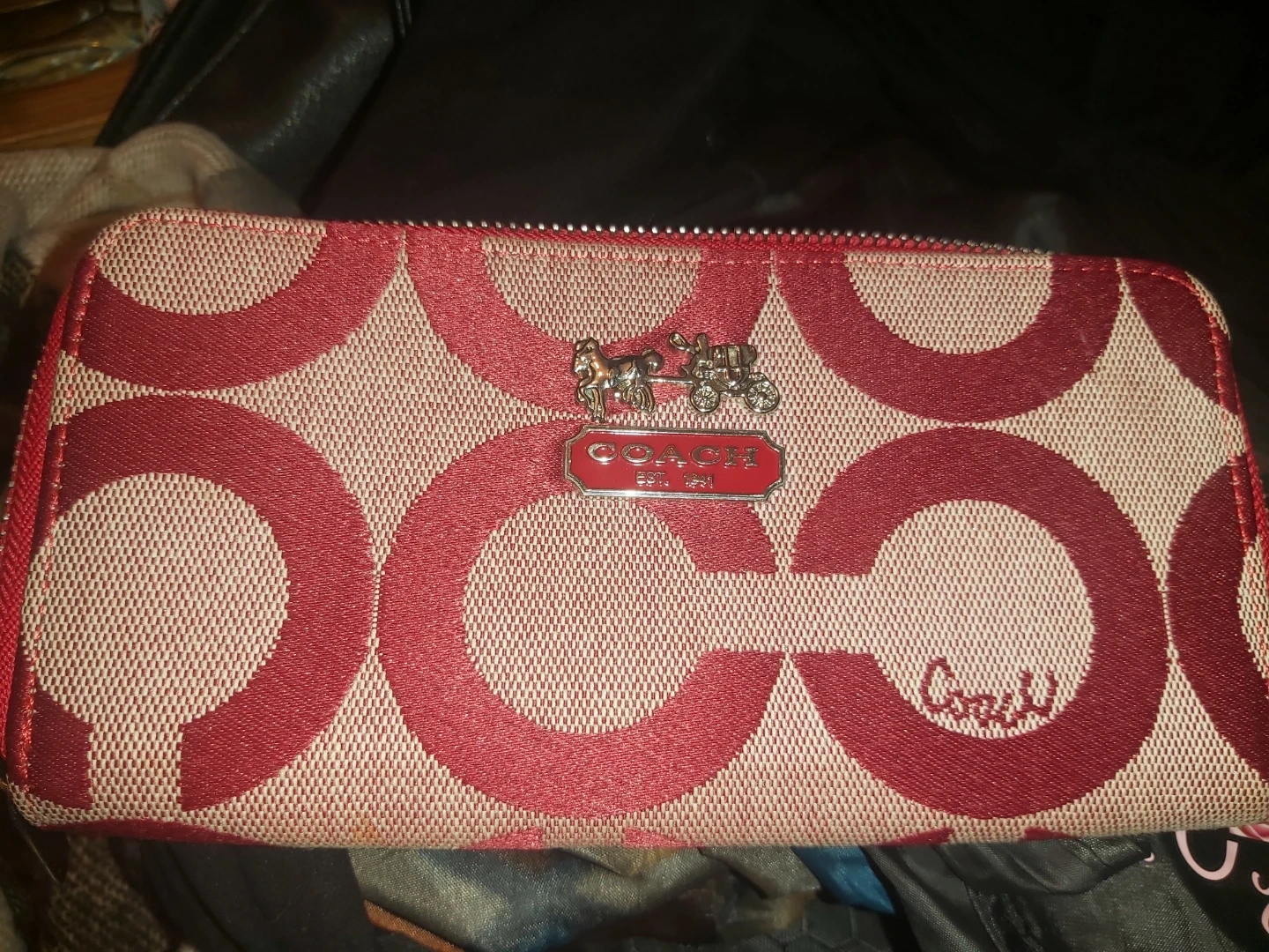 This is a Coach zip-around wallet featuring the signature 'C' pattern in red and beige. It has a metal logo accent and a zip closure to keep your essentials secure. This wallet is made with durable canvas material.