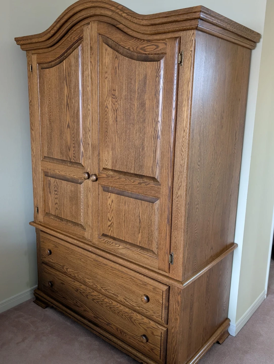 This solid wood armoire offers ample storage with its hanging rod, shelves, and three drawers. It's crafted from warm-toned wood with classic detailing. Perfect for organizing clothing and accessories!
