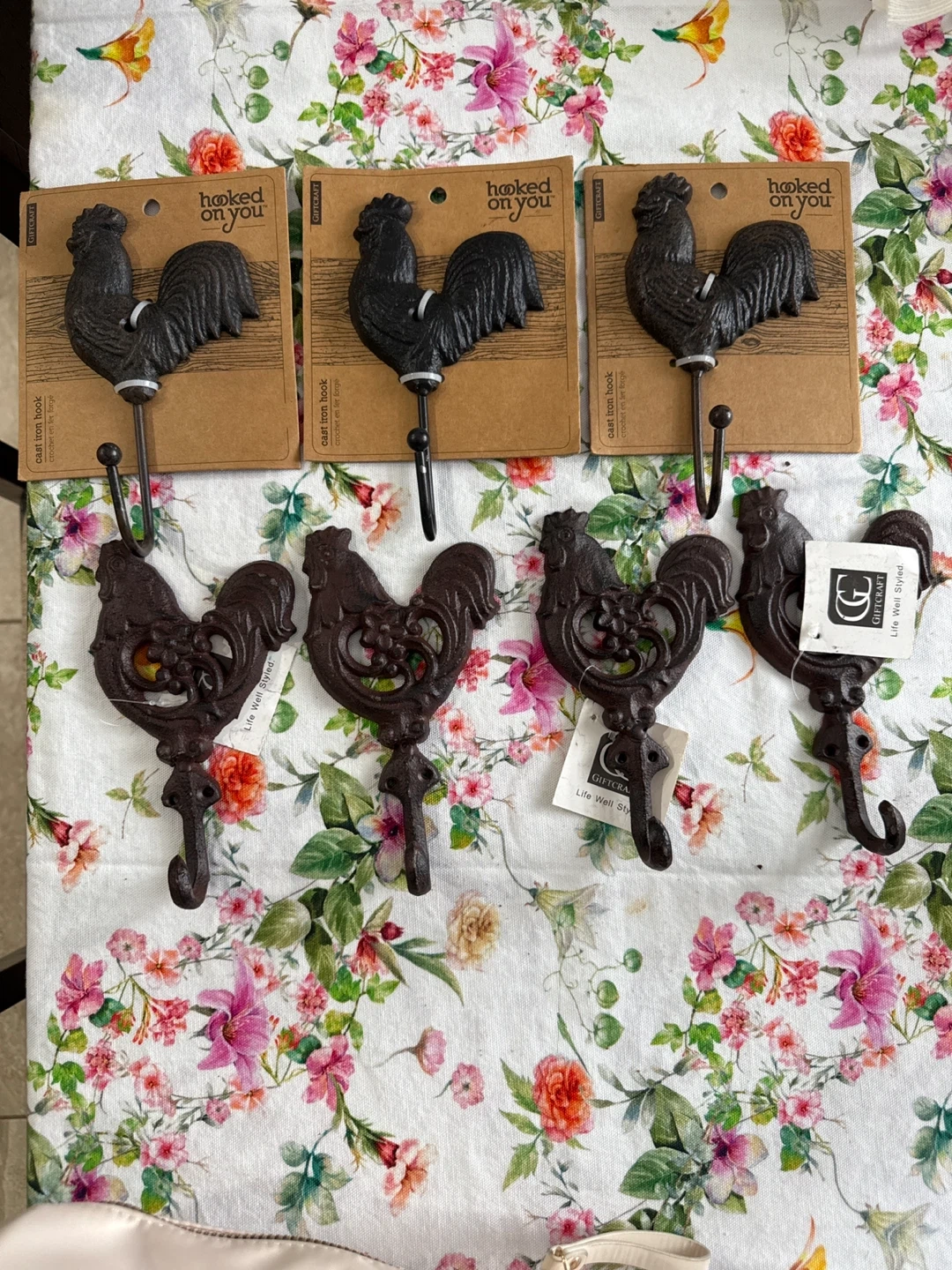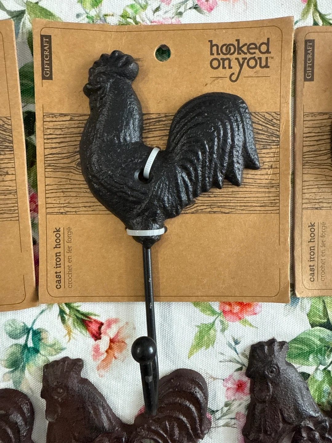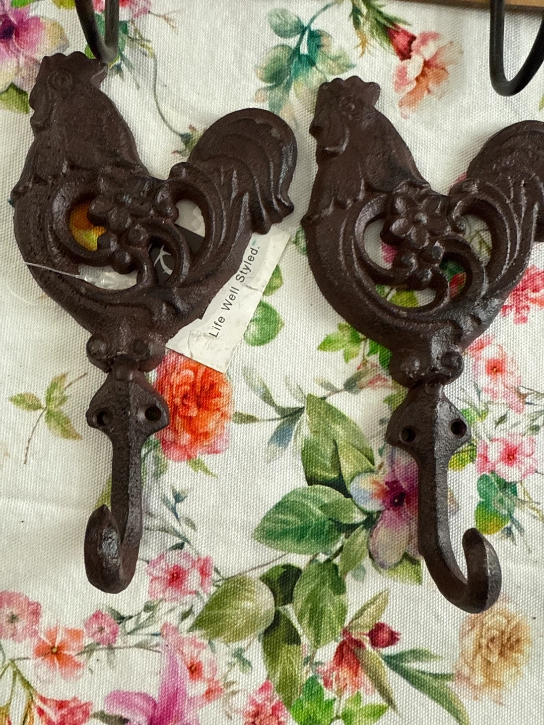 This is a cast iron hook shaped like a rooster, perfect for hanging light items. It's a charming decorative piece for any wall. Great for keys or small bags! Set of 7