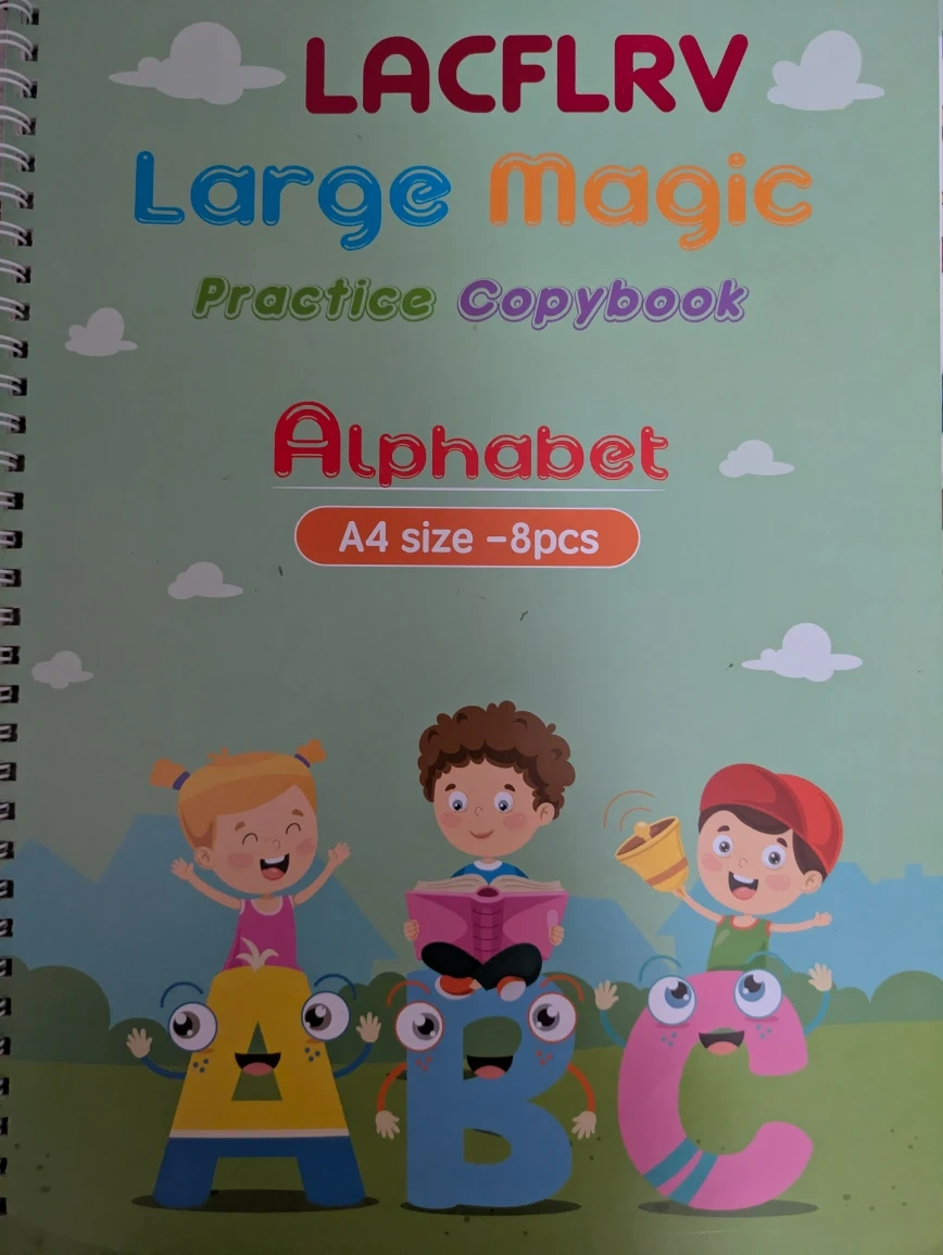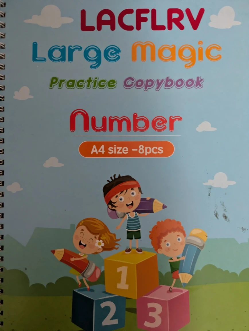 This is an 8-piece set of A4-sized large magic practice copybooks for numbers and alphabets. They're designed to help kids with handwriting practice and learning basic concepts. Perfect for young children just starting to learn their letters and numbers!