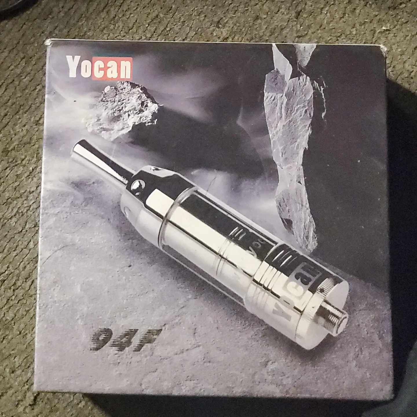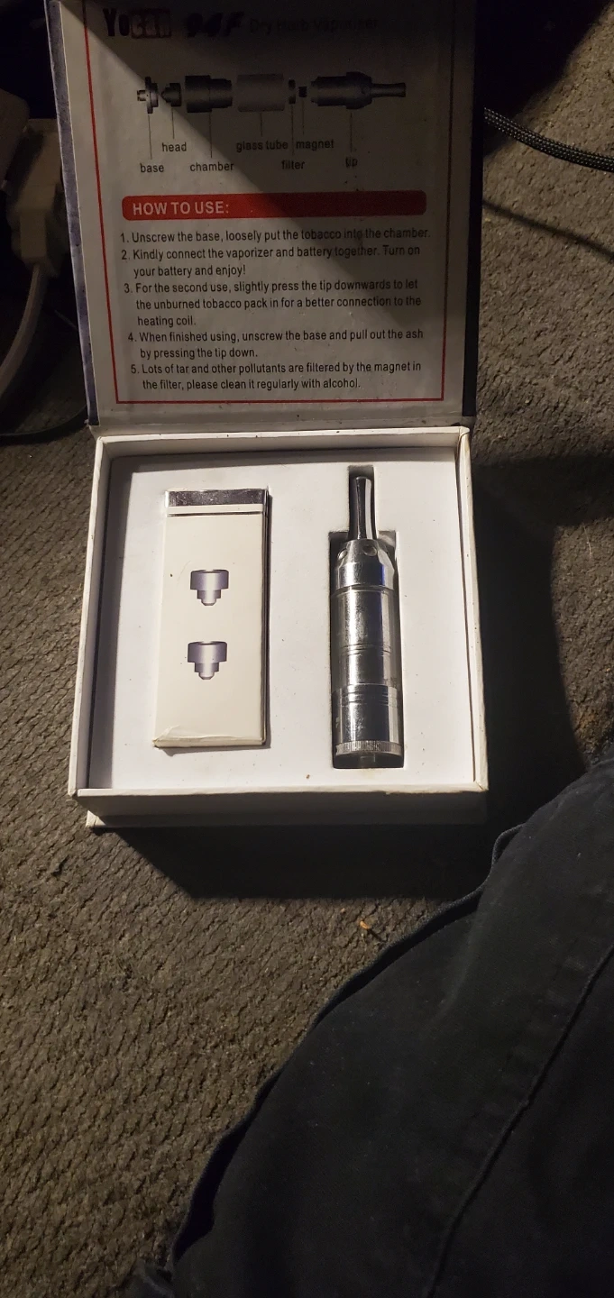 This is a Yocan 94F vaporizer. It's designed for dry herb use and comes with a glass tube and magnet filter. It also includes the original box and instructions for use.