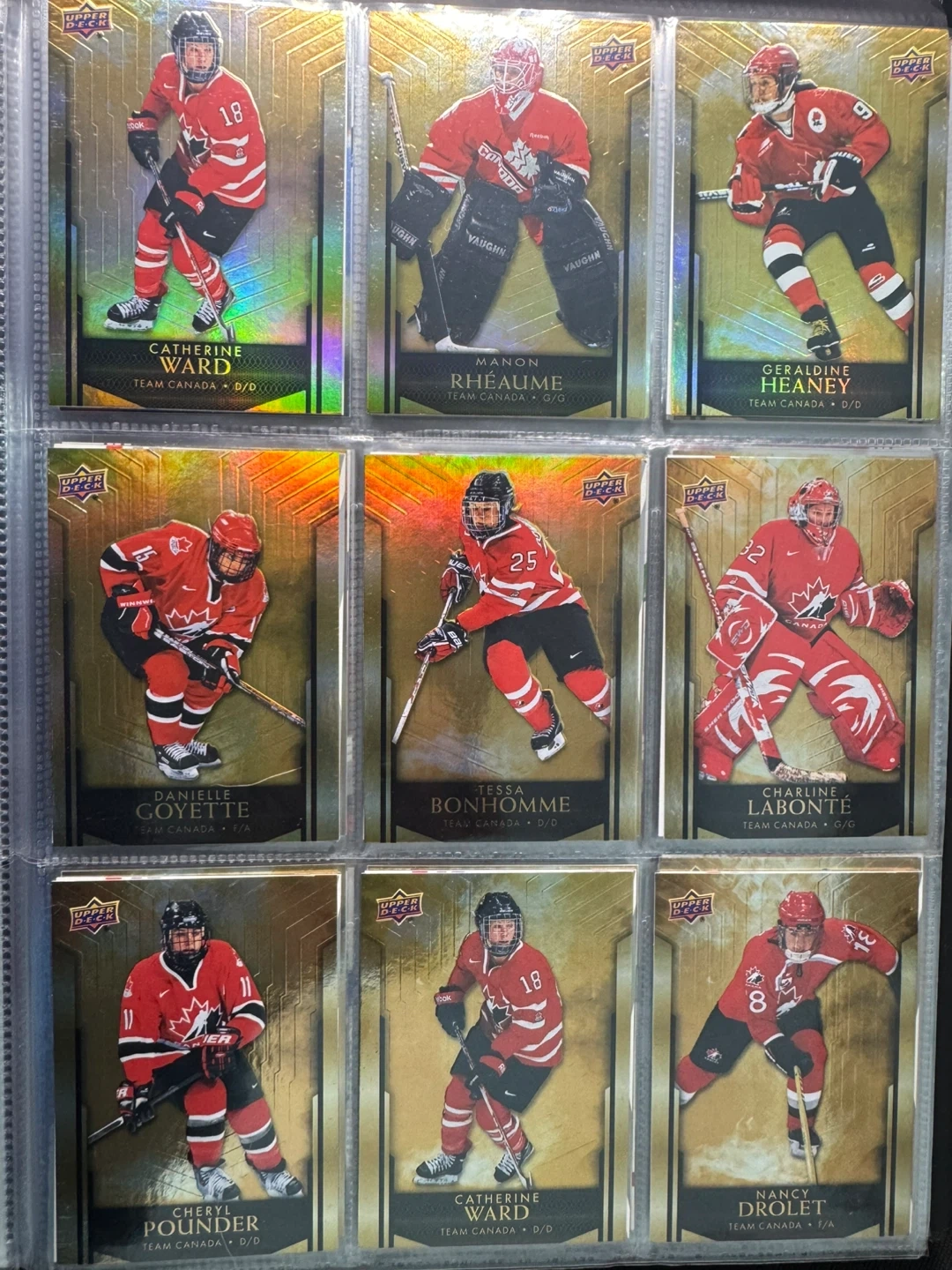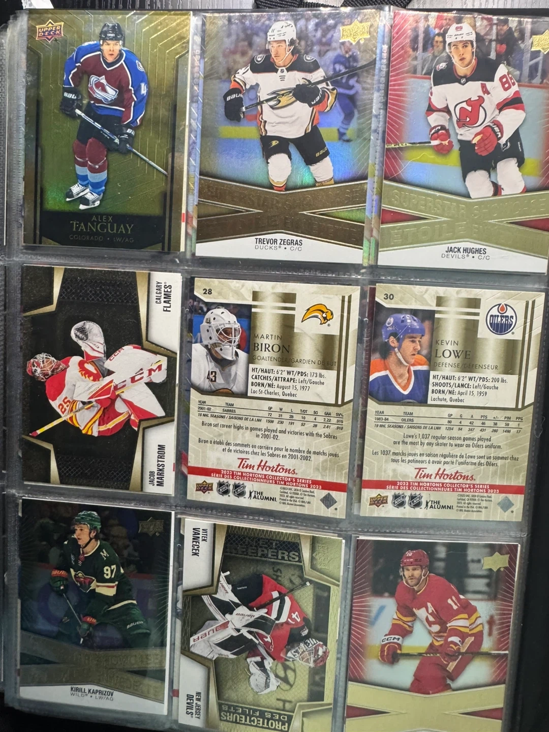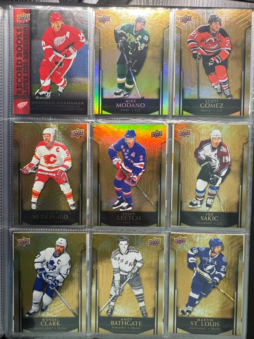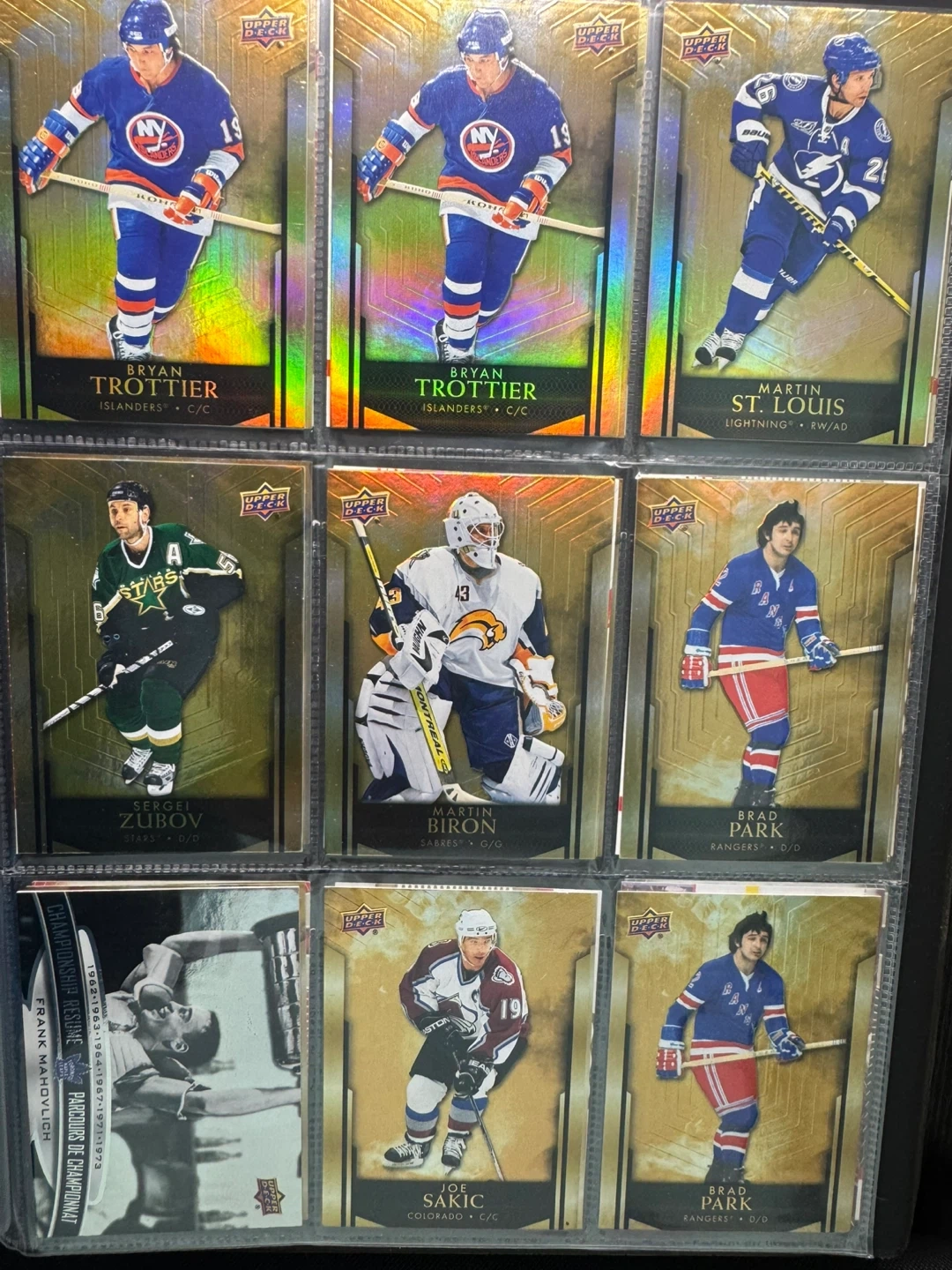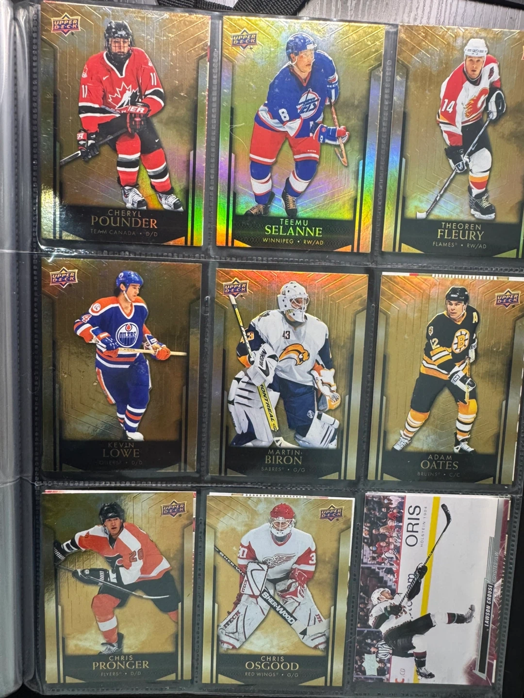 This is a collection of Upper Deck hockey cards featuring various NHL players. The cards showcase players from different teams and eras. They're in a binder for display. Whole binder included