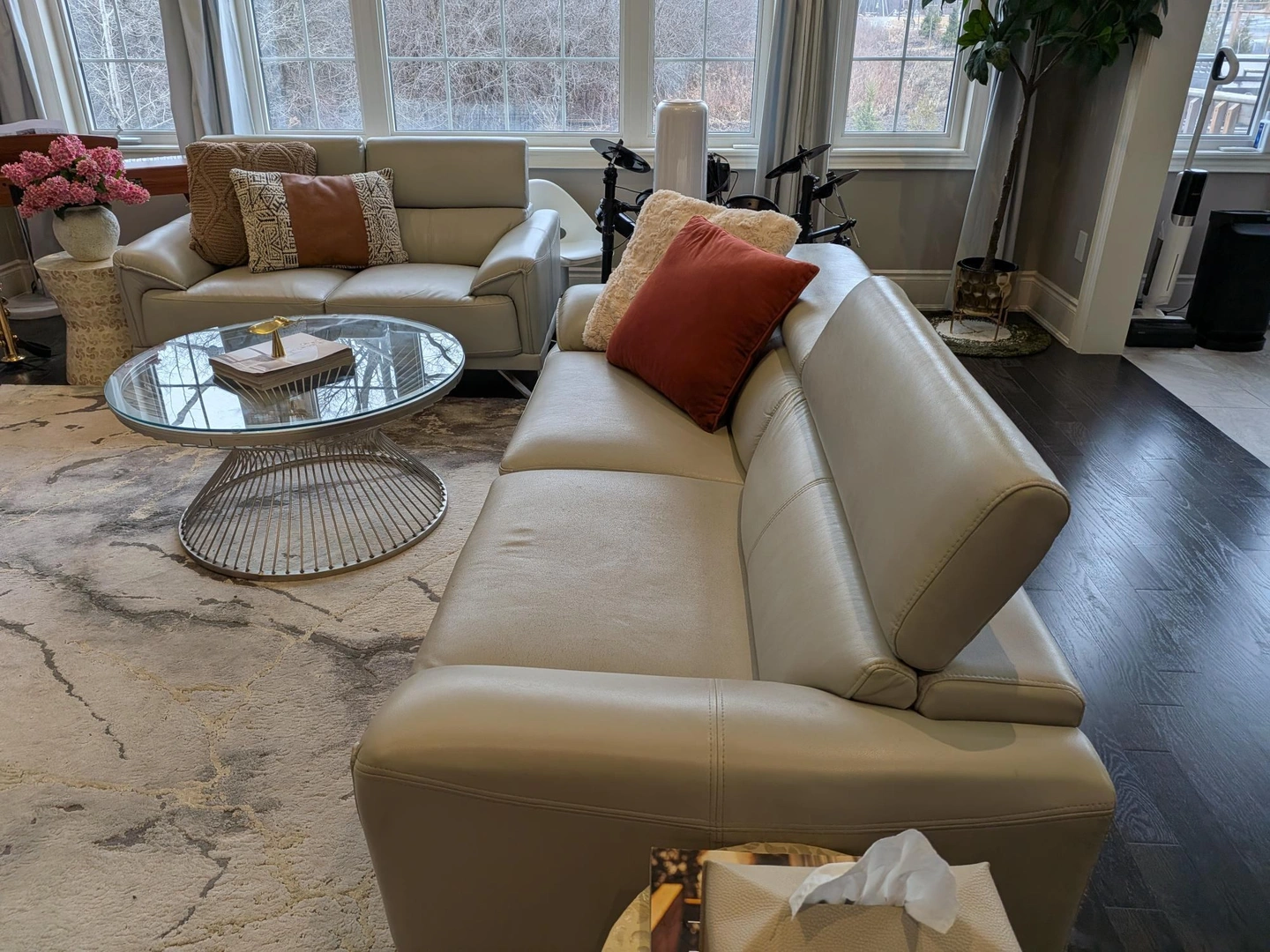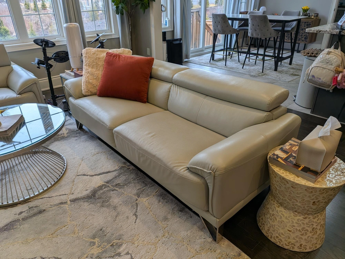 Grey Leather Sofa Set. Two + Three. Modern, 4 years old.
