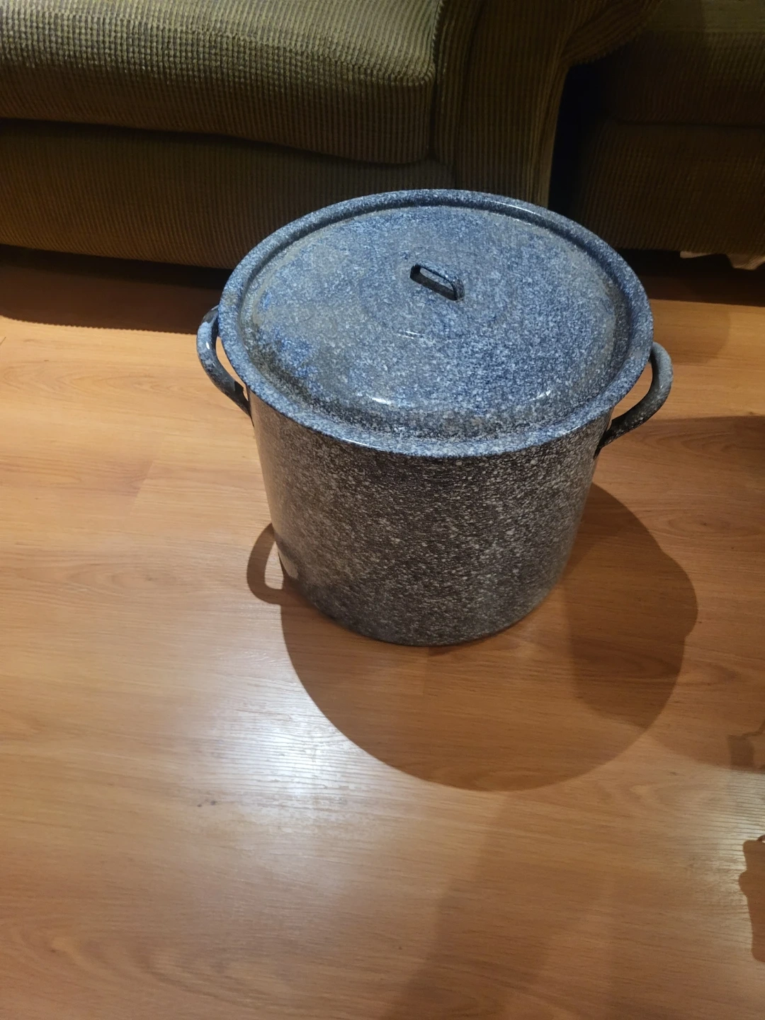This is a large antique granite ware stock pot with a lid. It has a speckled blue and grey finish and two handles for easy carrying. It's great for making large batches of soup or stew. Approximate capacity 15 quarts.