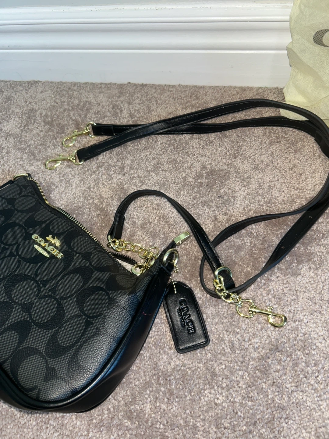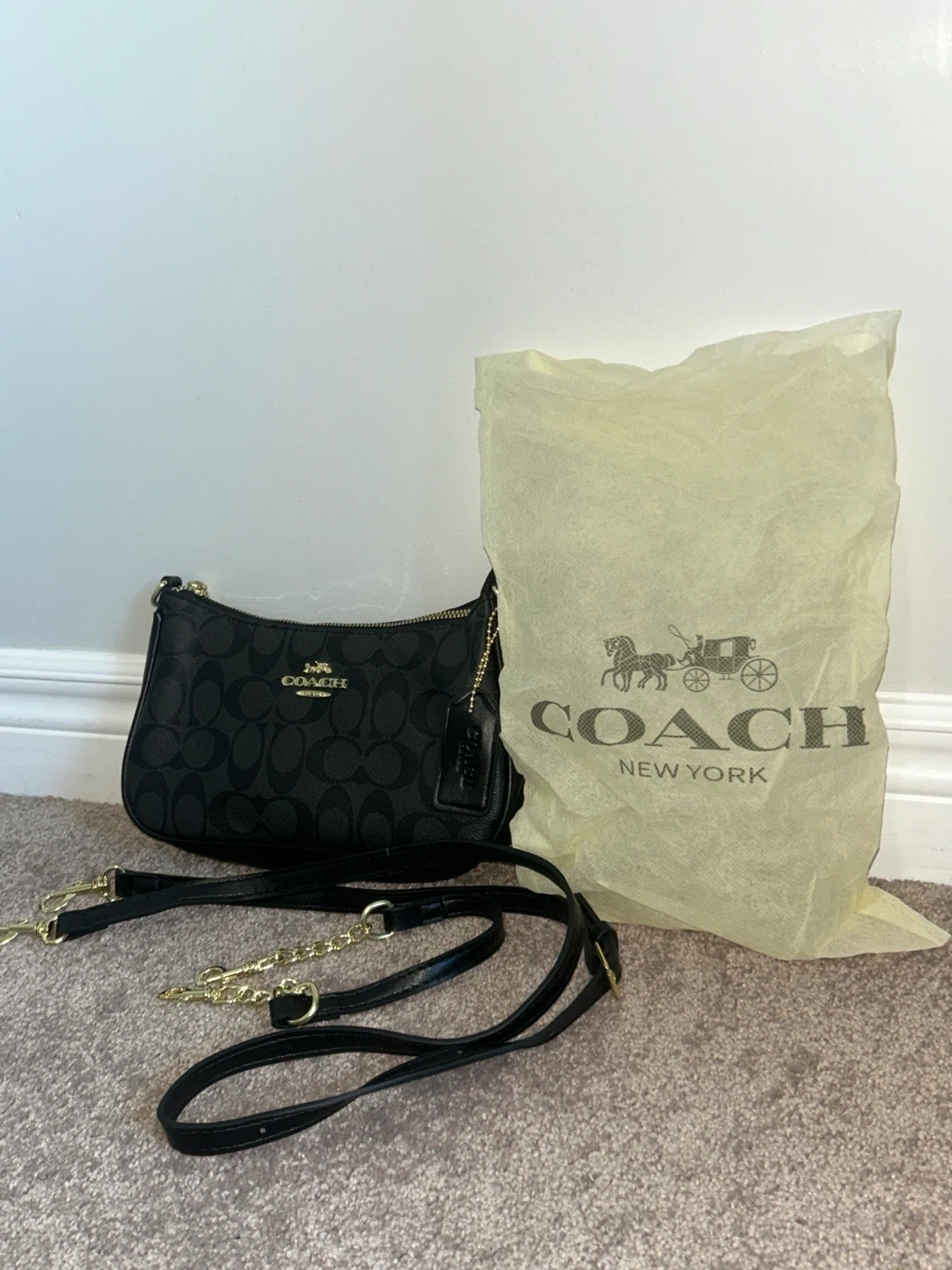 Black Coach shoulder bag. It's made from coated canvas and has gold-tone. Includes detachable crossbody strap and dust bag.