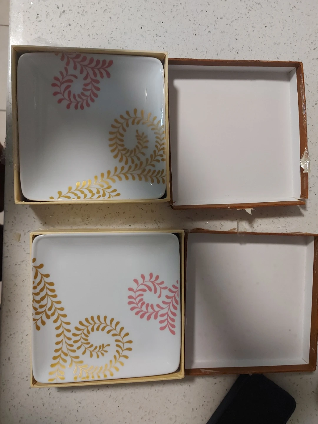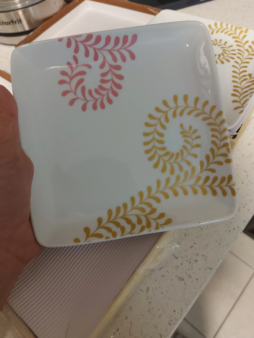 9 square dessert plates, each featuring a delicate pink and gold floral design. These plates are ideal for serving appetizers or small desserts. Dishwasher safe.