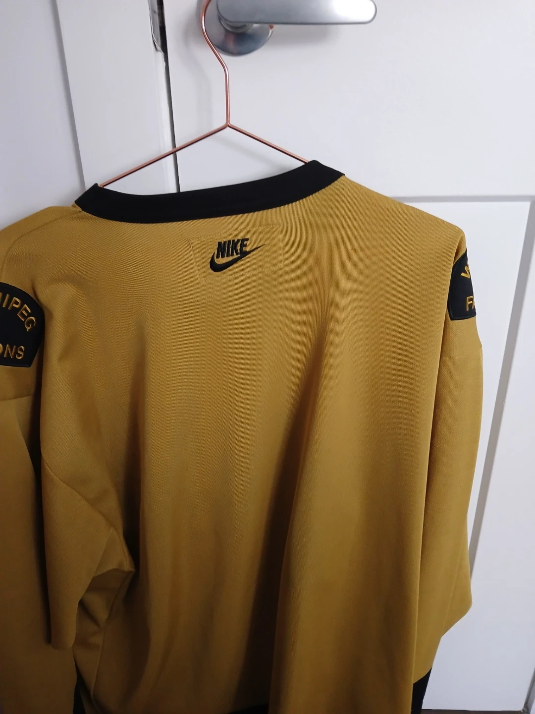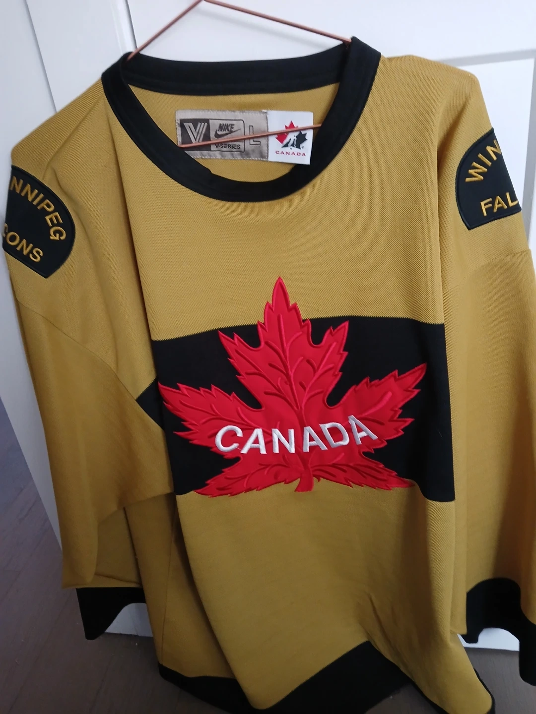 This is a Nike hockey jersey representing Canada. It features the iconic maple leaf with "CANADA" across the chest and "WINNIPEG FALCONS" on the left shoulder based on 1920s Olympic representation by the Winnipeg Falcons. This was from the 2006 v-series of vintage team canada jerseys. The jersey has a classic gold colour with black trim. Great for any hockey fan!