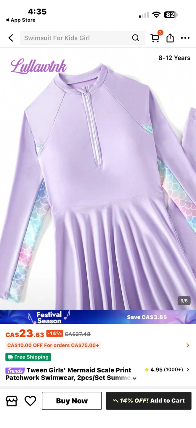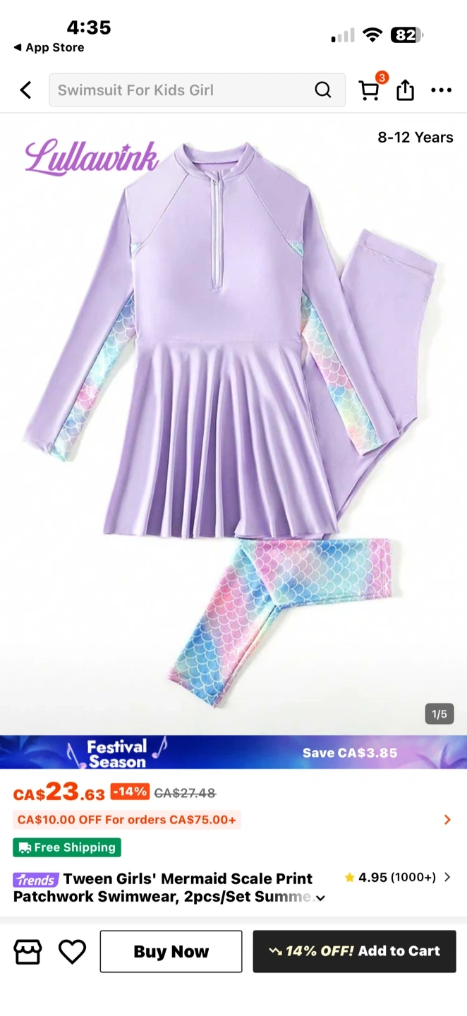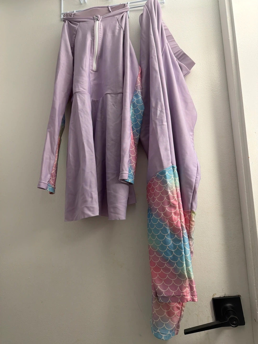 A lilac long-sleeved swimsuit with rainbow mermaid scale accents on the sleeves and matching bottoms. This set is designed for kids aged 8-12 years. Perfect for swimming and beach days!