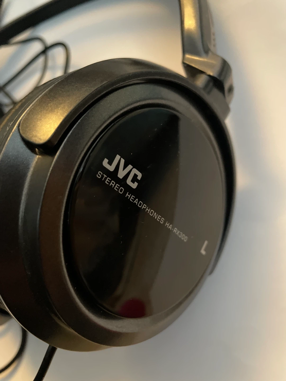 JVC stereo headphones, model HA-RX300. These are over-ear headphones with a black finish. They feature padded earcups for comfort. Great for listening to music or podcasts!