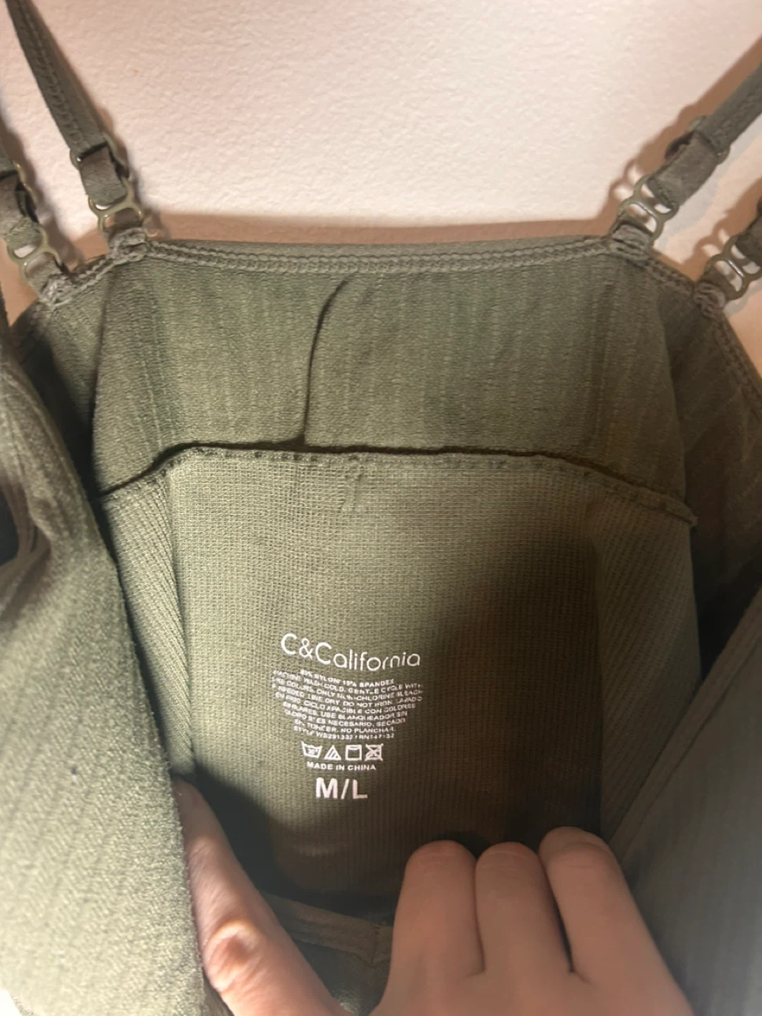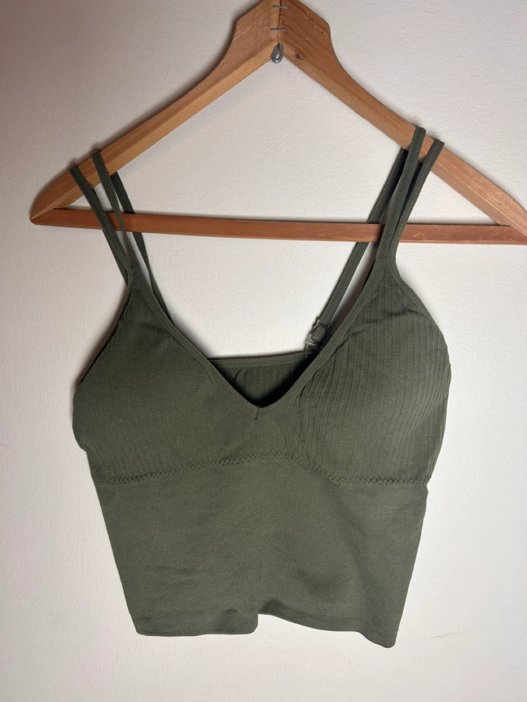 This crop top is olive green with a ribbed texture. It's a size M/L, but I feel it fits more like a small. It has removable pads. It is stretchy. Made with 95% nylon and 5% spandex. This top is great for everyday wear.