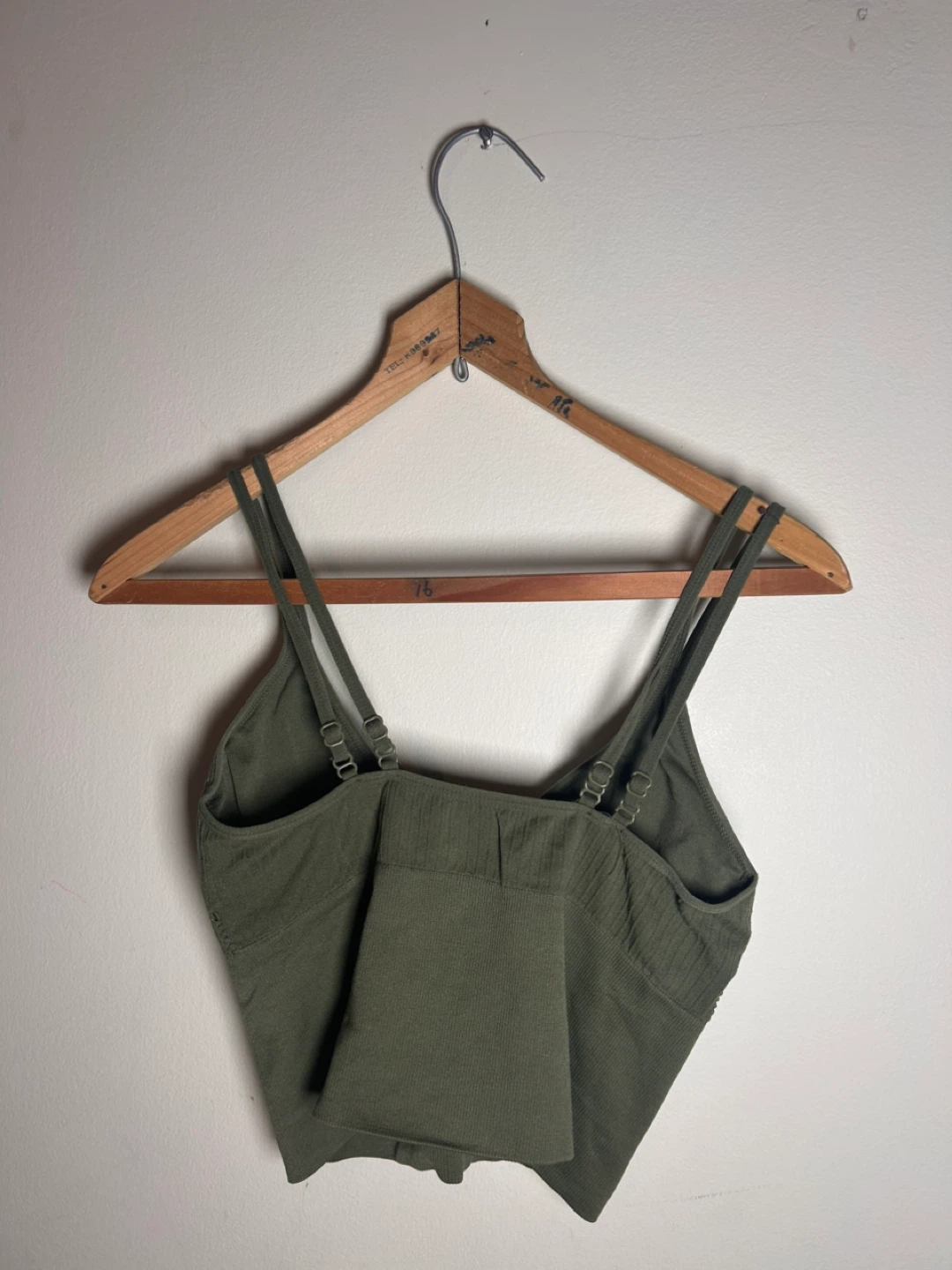 This crop top is olive green with a ribbed texture. It's a size M/L, but I feel it fits more like a small. It has removable pads. It is stretchy. Made with 95% nylon and 5% spandex. This top is great for everyday wear.