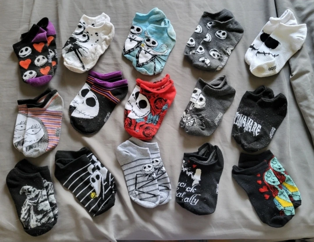 A collection of Nightmare Before Christmas socks! There are various designs and colours. All in good condition, perfect for any fan of the movie!
