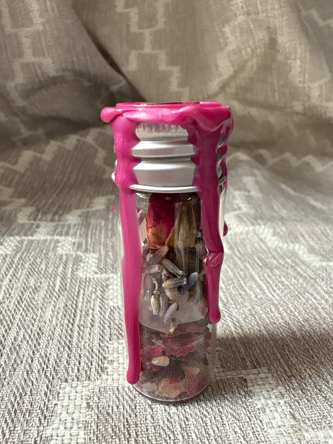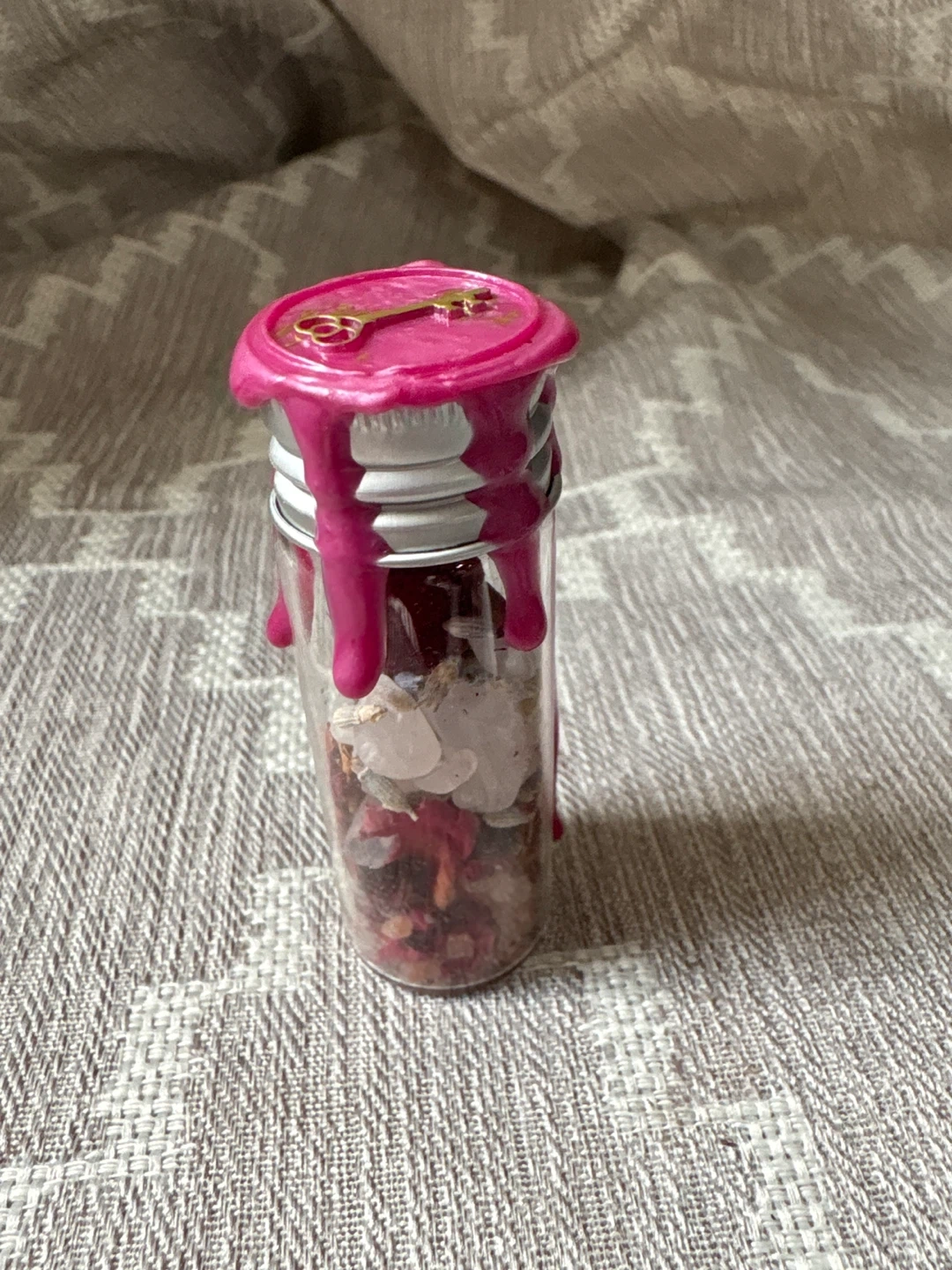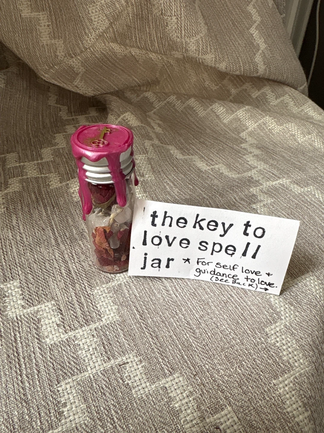 This spell jar is filled with herbs and crystals intended for self-love and guidance. It's sealed with hot pink wax and a small key design.