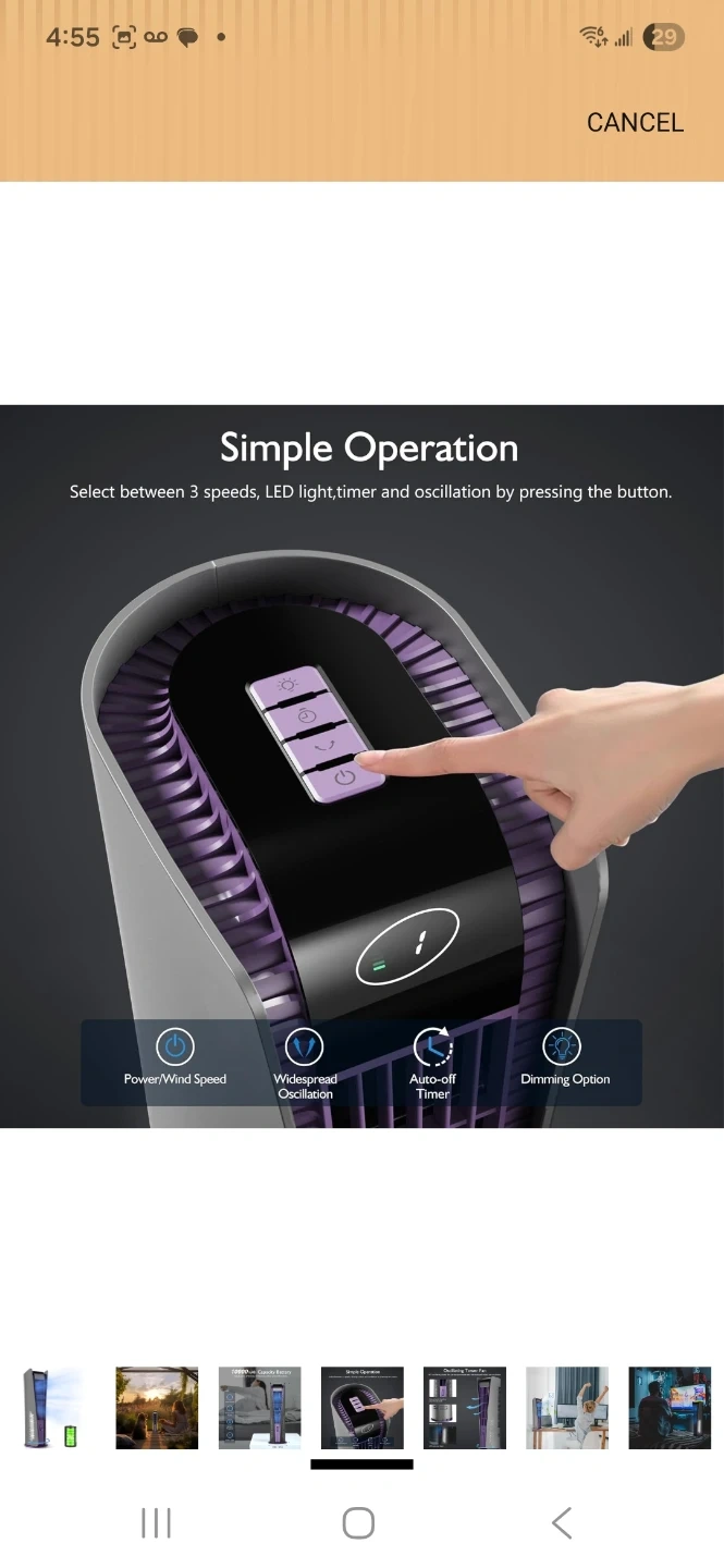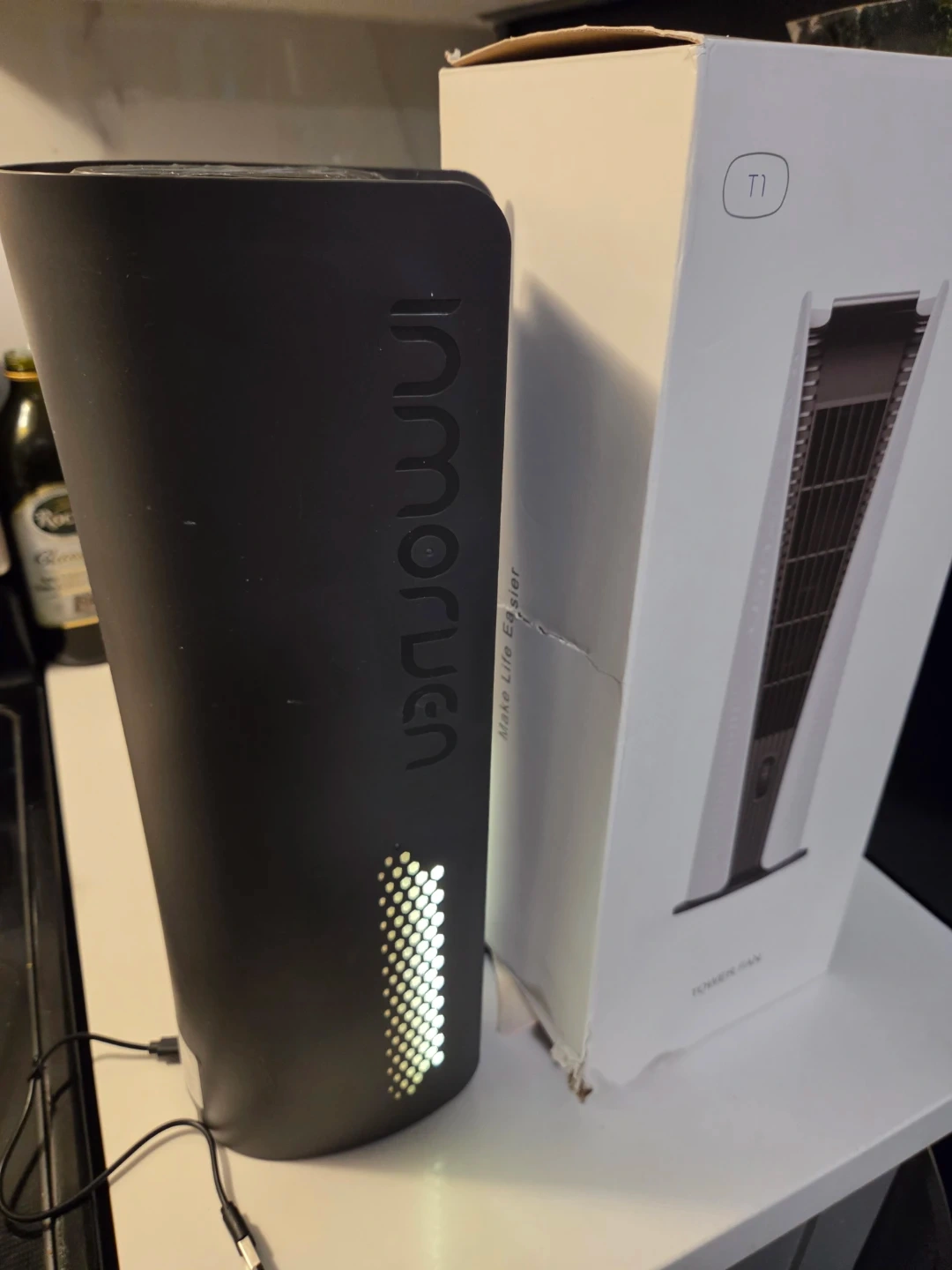 Inmorun tower fan with a 10000mAh battery capacity. It's 16 inches tall with a 6.5-inch diameter. This fan offers lower noise, tranquility breeze, and a night light. Includes original box.