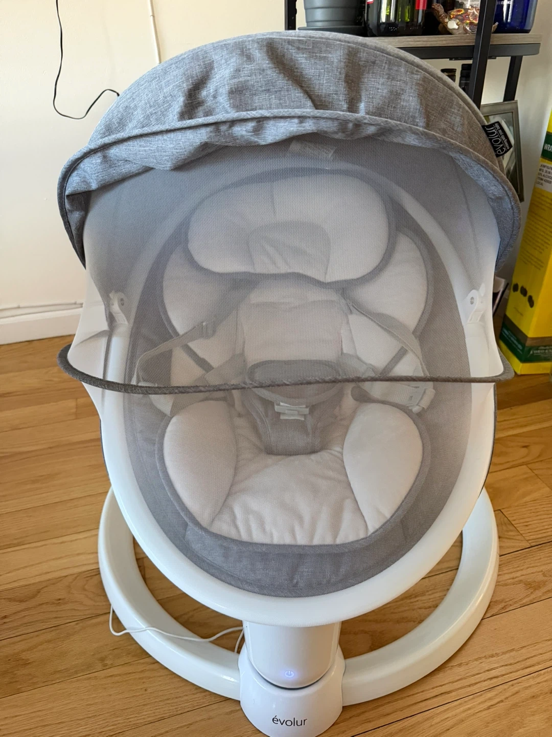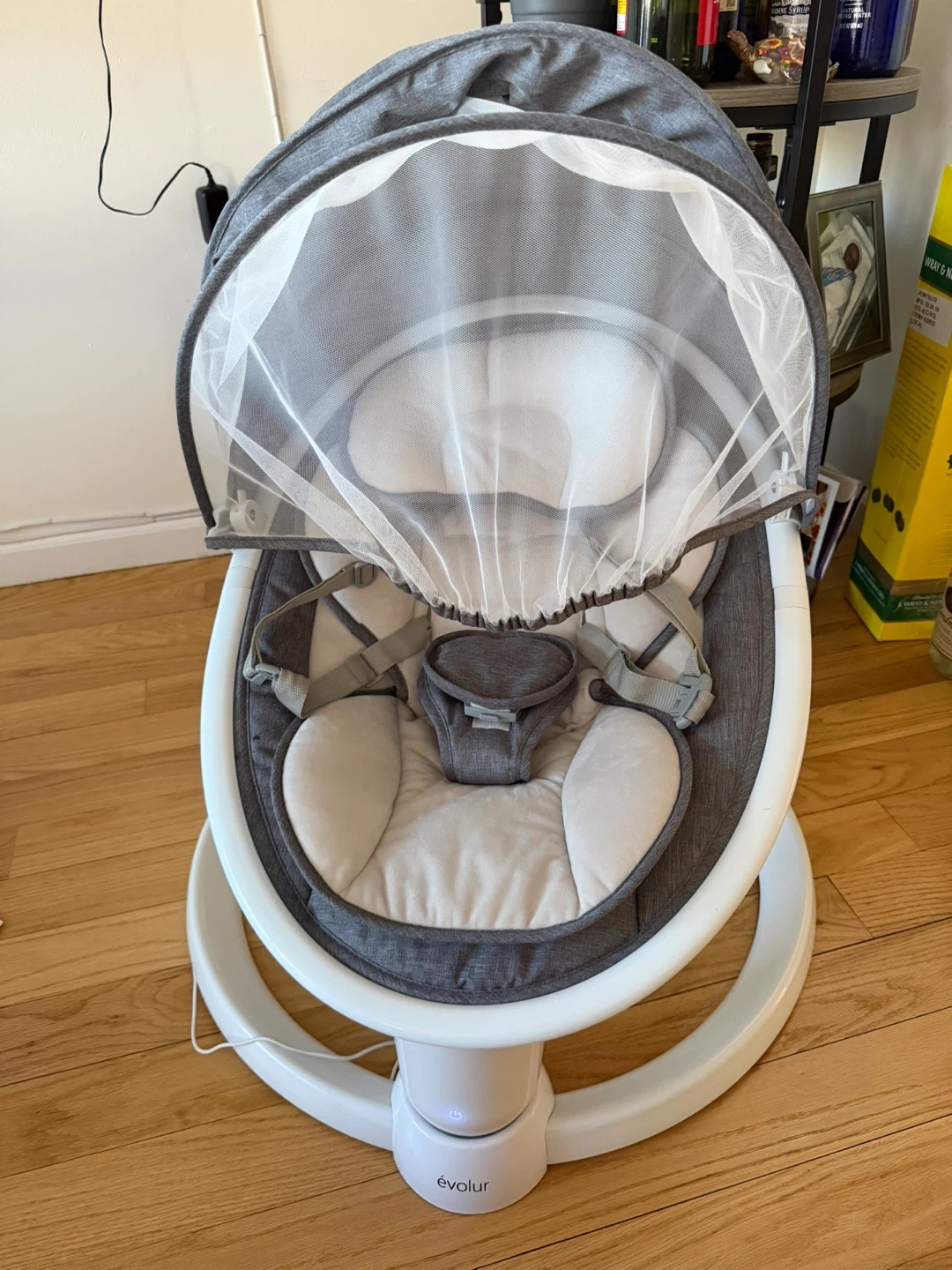 This baby swing features a comfortable padded seat and a protective mosquito net. It includes a secure harness for safety. The neutral gray and white colors fit any nursery decor.