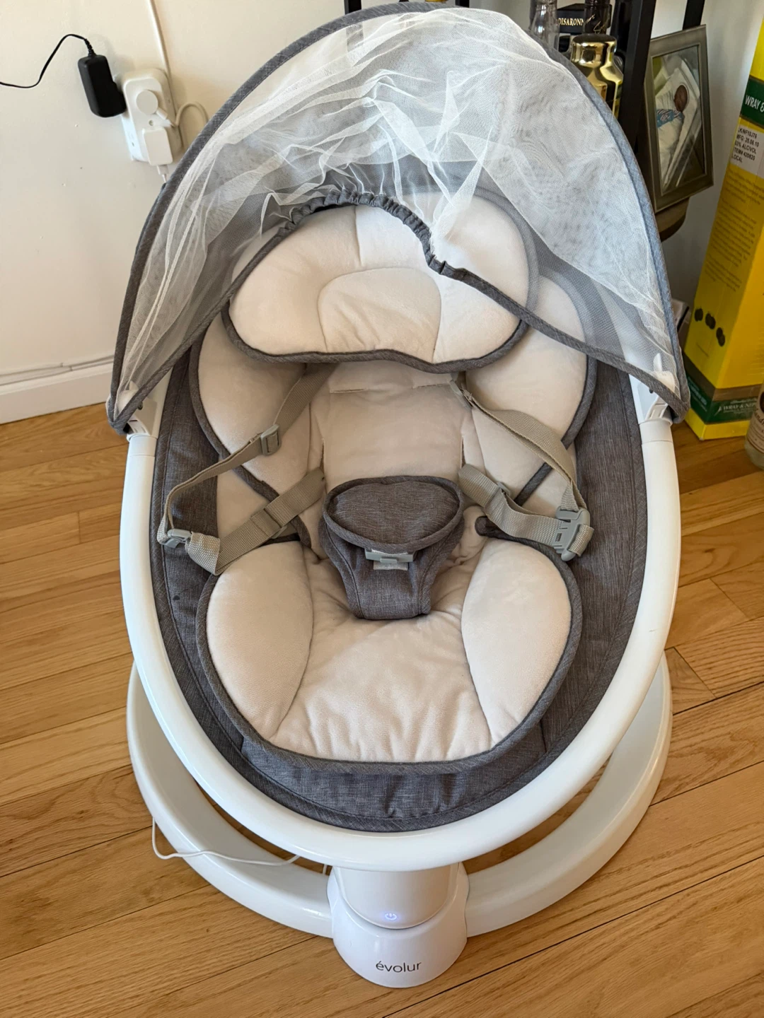 This baby swing features a comfortable padded seat and a protective mosquito net. It includes a secure harness for safety. The neutral gray and white colors fit any nursery decor.