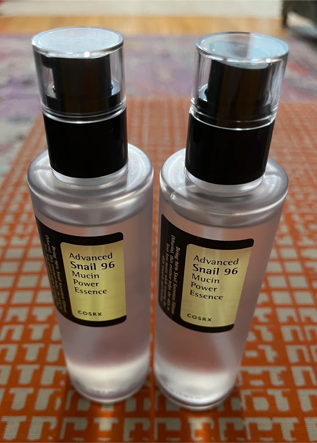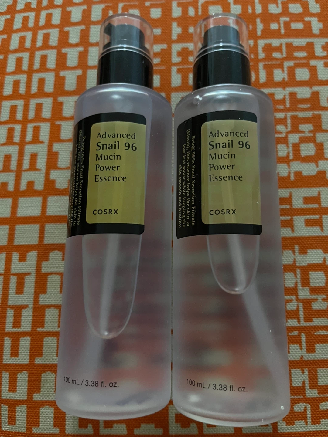 Selling two bottles of COSRX Advanced Snail 96 Mucin Power Essence. Each bottle is 100 mL (3.38 fl. oz.). Apply evenly to face for smoother, healthier skin. Made in Korea.